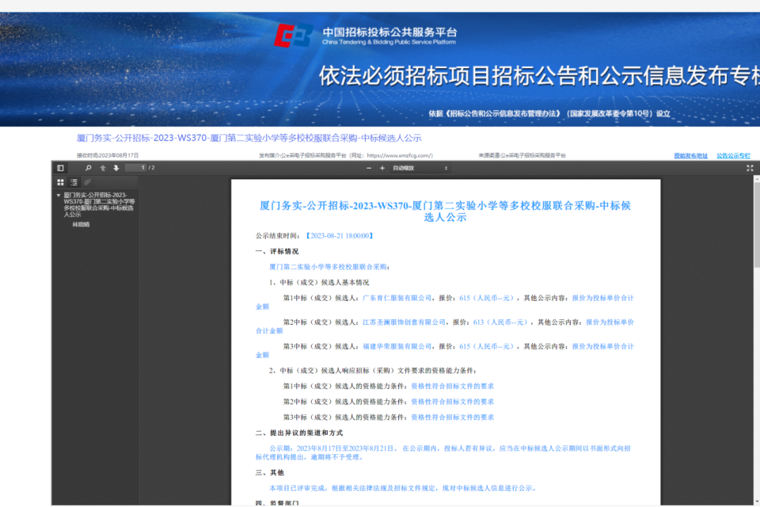 我校受家长委员会委托采购2023年学生校服相关事宜。于2023年7月20日启动相关采购流程,并委托厦门市务实采购有限公司进行校服的招标采购工作。8月17日,经专家现场评审出运动服供应商三家中标候选人,现公示如下: