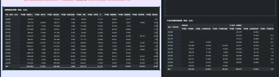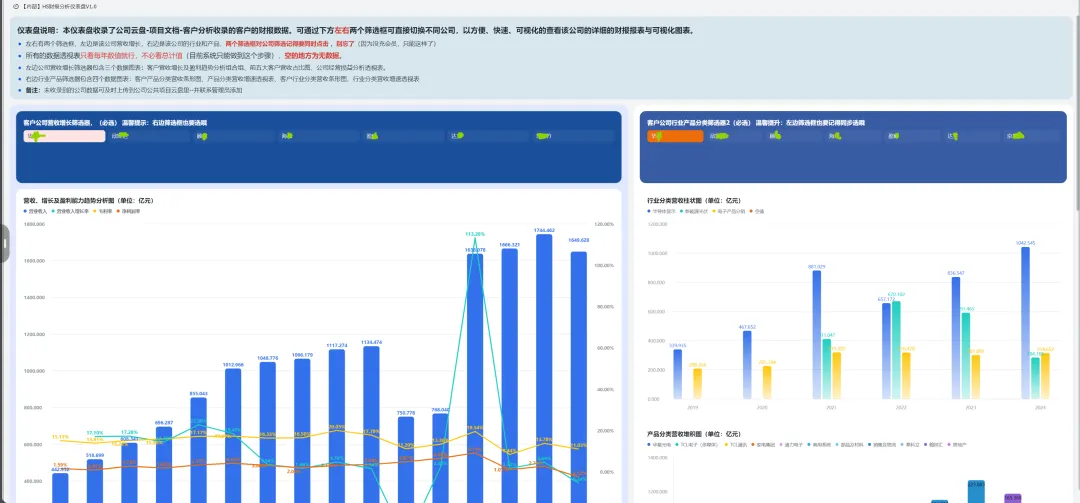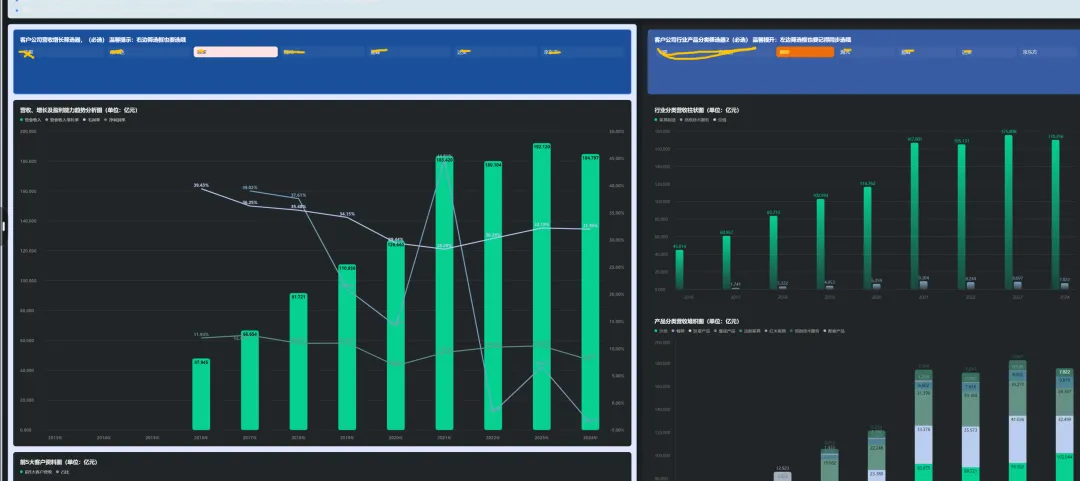 趋势分析一目了然: 从2008年到2023年的长期数据,通过双轴图表(柱状图展示收入,折线图展示毛利率/净利率),让增长趋势和盈利能力的变化轨迹清晰可见。 关键指标高亮: 无论是最大客户贡献额,还是行业分类数据,都能通过色块和高亮清晰呈现,辅助管理者快速决策。