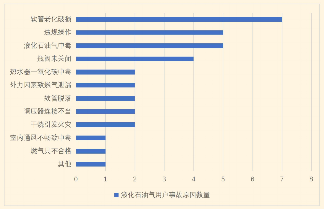“报告”显示(见上图),2023上半年造成液化石油气用户事故最多的因素为:软管老化破损、违规操作、液化石油气中毒、瓶阀未关闭,其中软管老化破损排第一位,这与液化石油气瓶需要反复充装、换瓶,软管维护缺失等有很大关系。