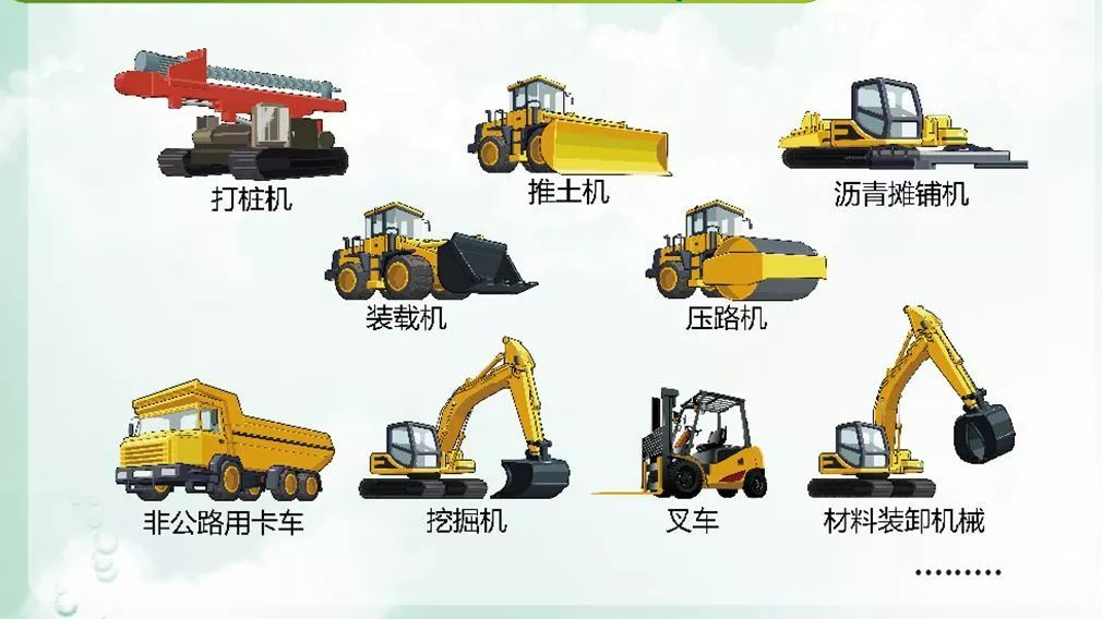 挖掘机、起重机、推土机、装载机、压路机、摊铺机、平地机、叉车、桩工机械、堆高机、牵引车、摆渡车、场内车辆等均属于非道路移动机械。