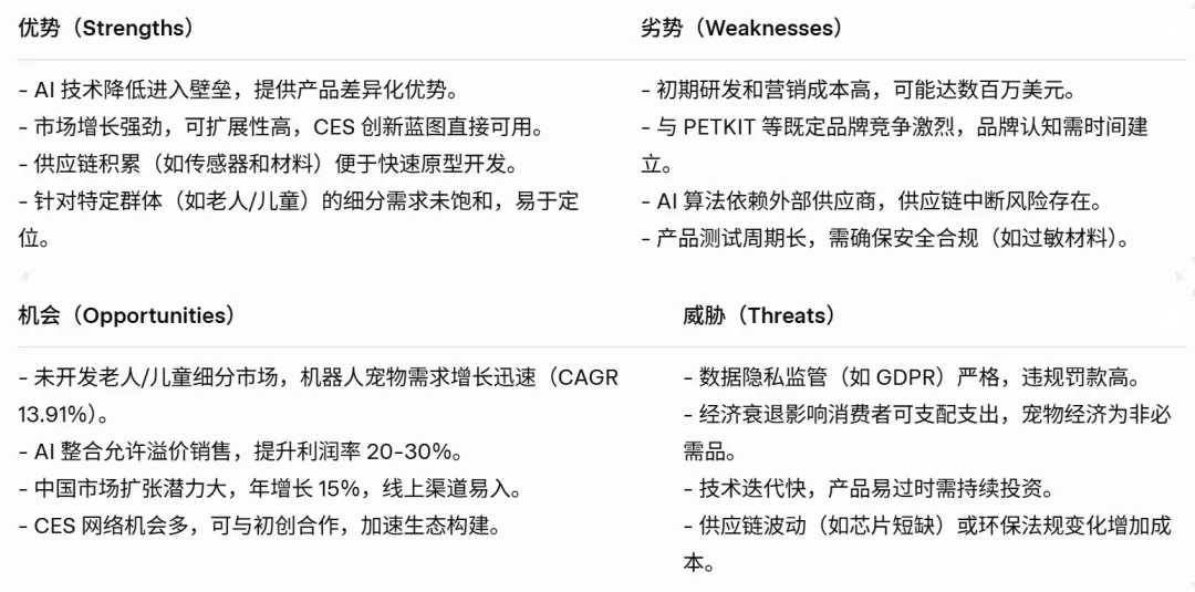 基于 CES 2026 的洞见和市场数据,进入宠物经济领域值得推荐,尤其对拥有制造积累的新进入者。该领域整体前景乐观,宠物护理产品提供即时收入和稳定增长(CAGR 7.2%),适合作为切入点,通过智能喂食/监测设备快速占领市场份额;机器人宠物则挖掘高潜力细分市场(CAGR 13.91%),针对过敏/卫生限制群体(如老人和婴幼儿家庭),可作为中长期增长引擎。新进入者应优先从 AI 增强、可持续解决方案起步:初期聚焦 ODM 合作降低风险,目标市场份额 5-10%;中期通过专利保护和生态整合(如 App 与兽医平台联动)提升竞争力;长期监控 ESG 指标,确保合规并吸引投资。潜在回报包括年营收增长 20%以上,但需警惕监管和经济风险,通过多元化供应链和用户反馈迭代缓解。总体而言,此举可助力转型为科技驱动型企业,抓住全球宠物经济从传统向智能化的浪潮。