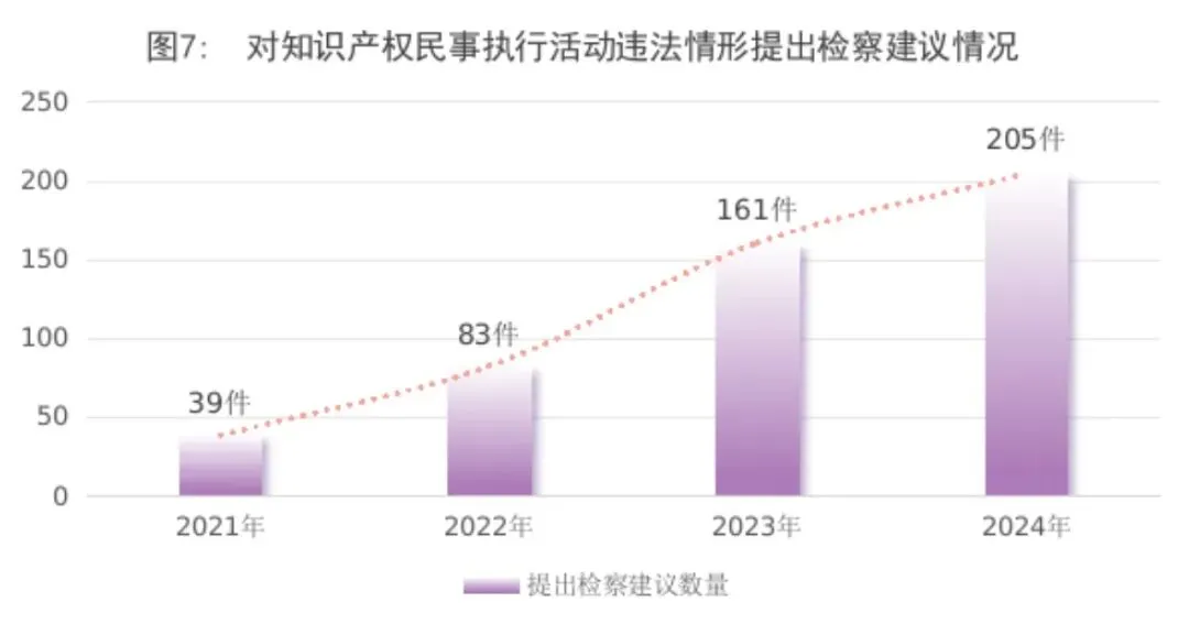 2.民事审判活动、执行活动监督有效开展。对知识产权民事审判活动违法情形提出检察建议223件,法院采纳222件;对民事执行活动违法情形提出检察建议205件,同比上升27.3%,法院采纳201件。