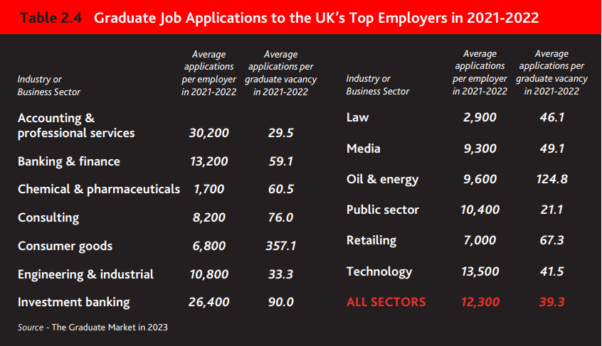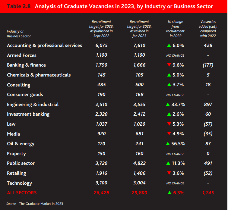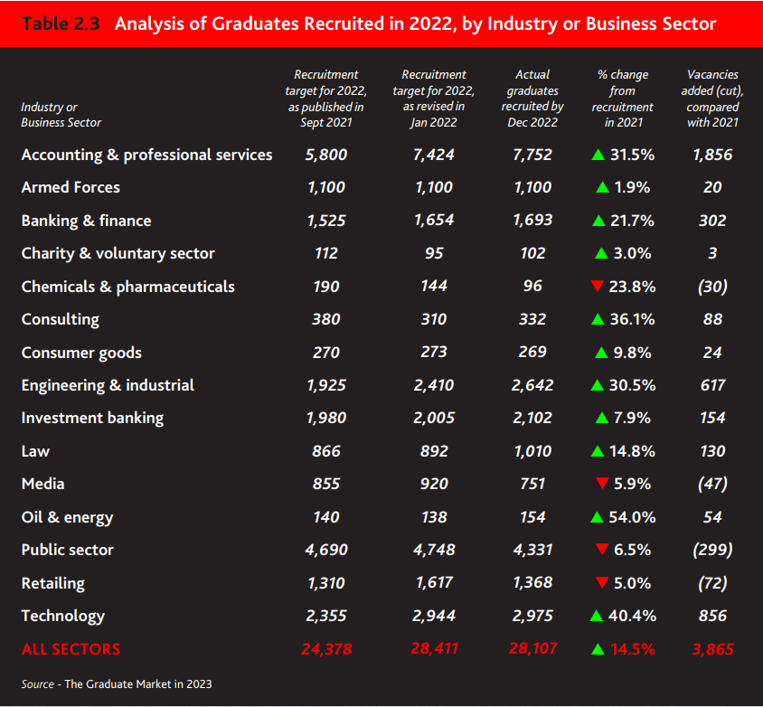 2023年15个最受欢迎的行业中,有11个行业招聘毕业生人数同比增加,特别是四大会计事务所,2022年招聘了2300多名应届毕业生,这是英国有史以来单一雇主招聘的最多毕业生。