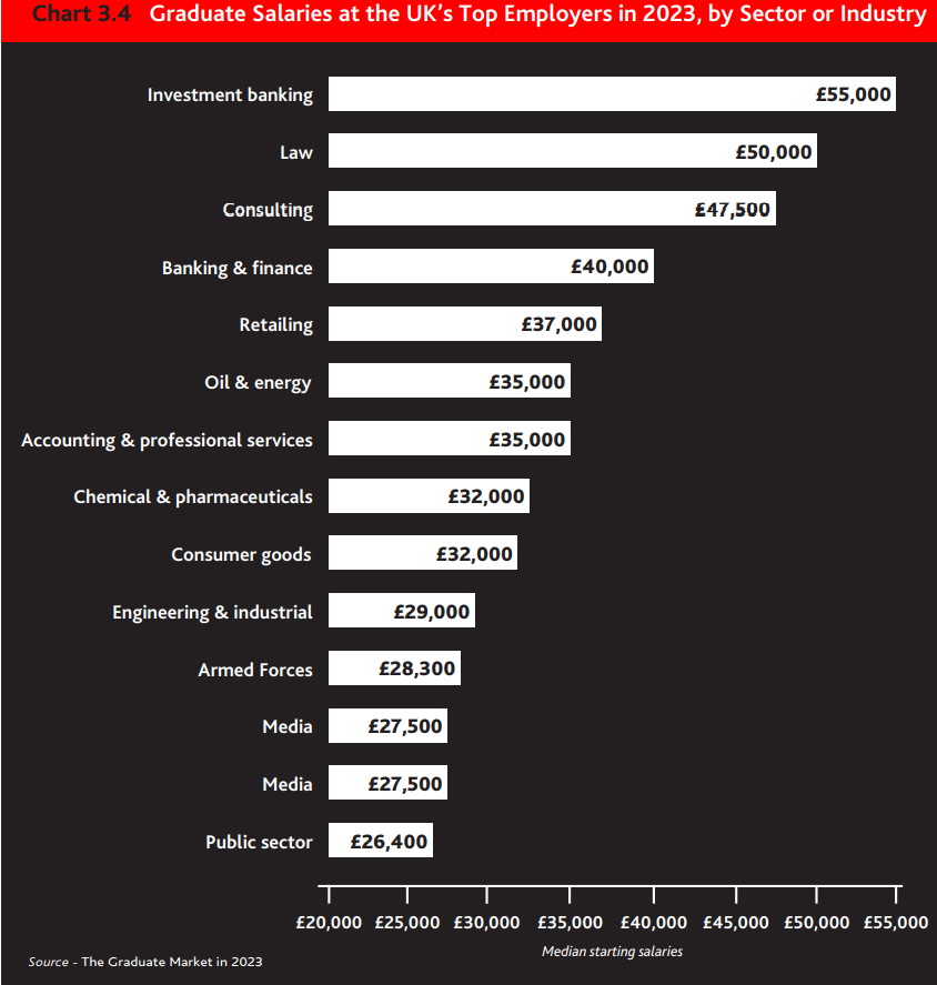 从行业来看,投行的起薪中位数最高,为55,000英镑;其次是律师事务所,起薪中位数为50,000英镑;之后是咨询公司,起薪中位数为47,500英镑: