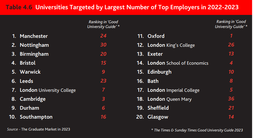 英国各大企业并不是仅仅围绕几所英国大学进行人才招聘,但综合统计来看,就职于英国TOP企业的毕业生还是有1/4毕业于牛津、剑桥及其他罗素集团大学(尤其是曼彻斯特大学)。