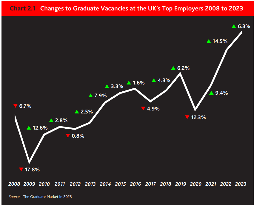 HF,2008-2023年英国毕业生空缺岗位数据变化图