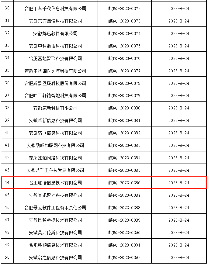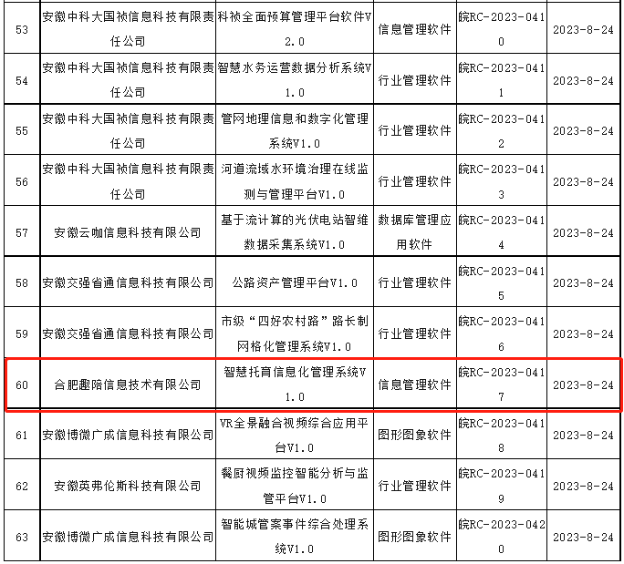 2023年8月,经安徽省软件行业协会专家评审组审核,同意“合肥趣陪信息技术有限公司”等50家企业评估为软件企业,“智慧托育信息化管理系统”等63件产品评估为软件产品。