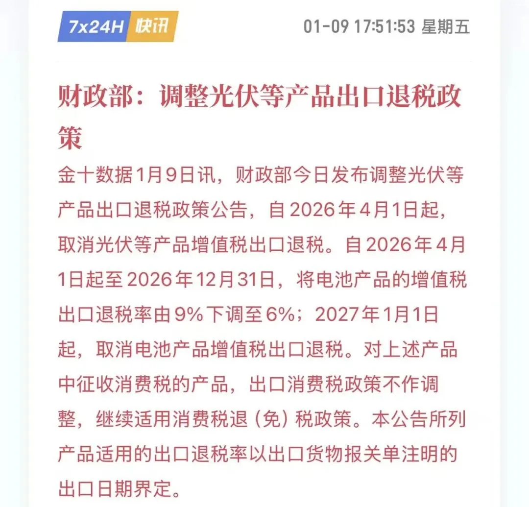 此次财政部取消光伏产品出口退税、下调电池退税的政策,并非简单的行业利空,而是国家层面推动光伏产业从“规模扩张”向“质量升级”转型的关键抓手,本质是通过政策工具倒逼行业出清低效产能、摆脱低价内卷,最终实现全球产业链话语权的提升。以下从政策本质、行业影响、企业分化、投资逻辑四个维度展开深度分析: