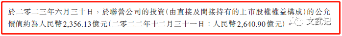 针对“公司投资”资产7824亿,其中上市公司公允价值4354亿,非上市公司账面价值3470亿(财报P17)。这个数据与资产负债表有一定的出入,上市公司中涉及联营公司部分资产在资产负债表中记录为投资成本为1244.4亿,对应公允价值为2356.13亿。与此相反,非上市公司中联合营公司按投资成本,其他公司按公允价值计量,在资产负债表中对应的非上市公司资产为3816.85亿。