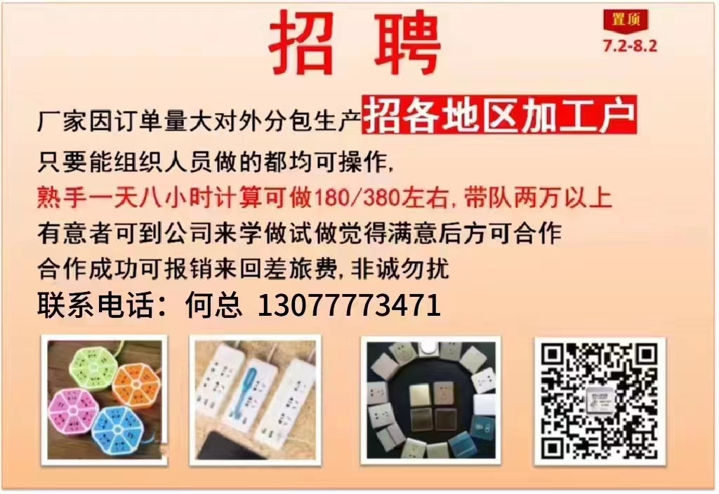 公司长期有电子配件组装对外承包加工,纯手工组装,加工,带回家做,不需设备,人手180/260天,多劳多得,可组织人做赚差价,长期合作公司包来回运输,首次合作需来公司考察学习,合作成功可报销来回车费。 联系人:何经理13077773471