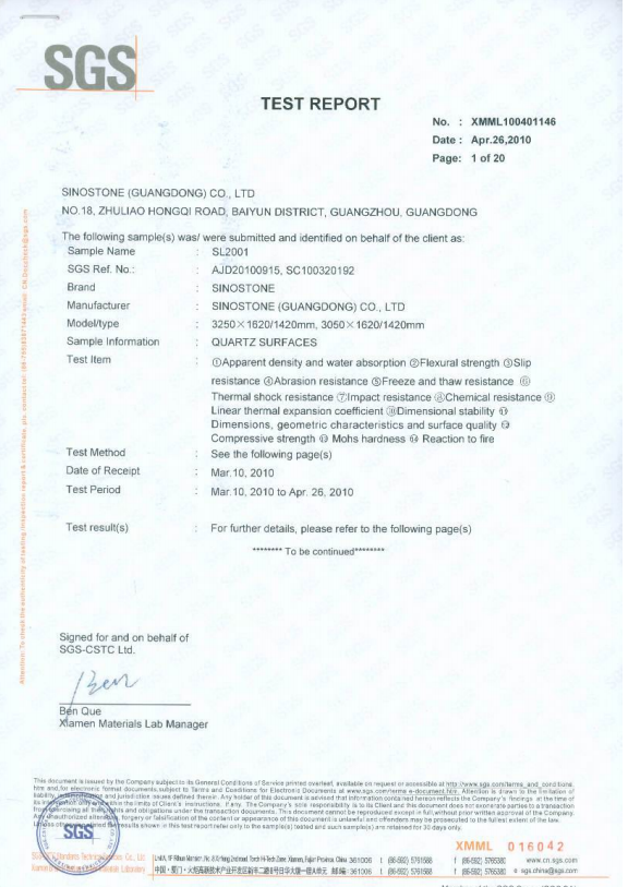 SGS是全球领先的检测、鉴定、测试和认证机构。琅帝石英石产品的性能从多个不同层面,不同角度,经SGS检测评估符合全球标准和当地规范。