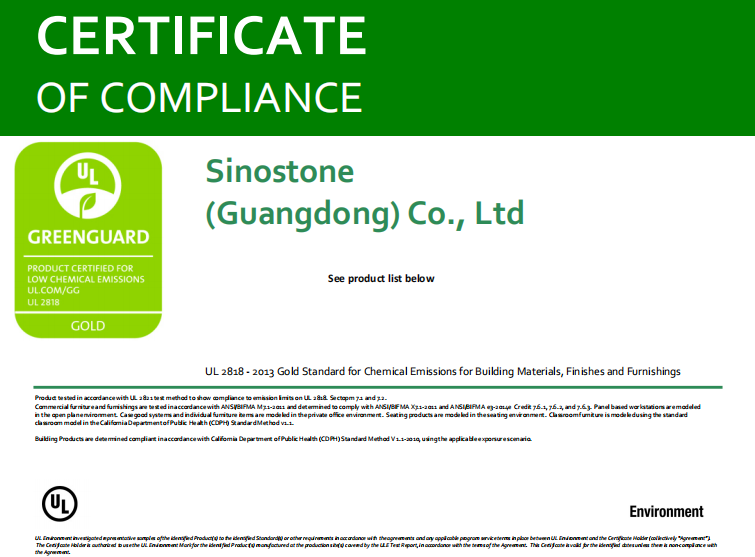 GREENGUARD 是国际公认的最权威的室内产品认证标准(针对产品在室内空气的化学挥发情况)。它已经获得包括LEED在内480多个可持续项目和规范的认可。此外,它的绿色资源数据库被超过200个国家的政府采购、公用机构、行业协会列为无害产品购买指南。此项证明琅帝石英石拥有国际最权威认证!