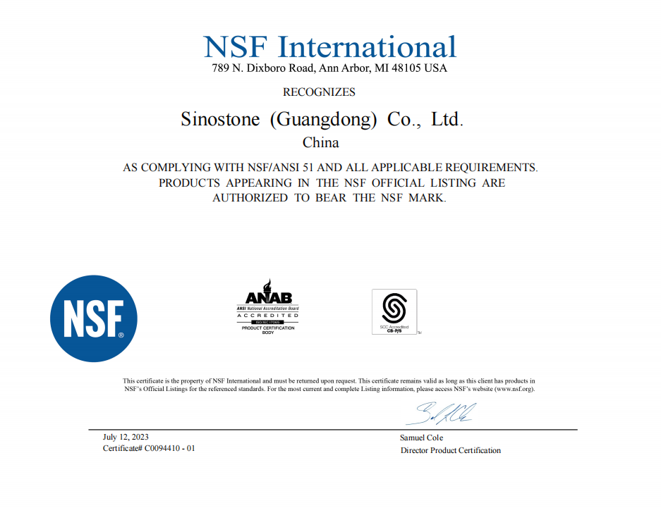 NSF(美国国家卫生基金会),是公共卫生和安全领域的权威机构。拥有NSF标识,证明琅帝石英石产品可以安全的运用于实验室、医疗设备、食品加工场所等,对公众健康、安全及环境都没有任何危害。