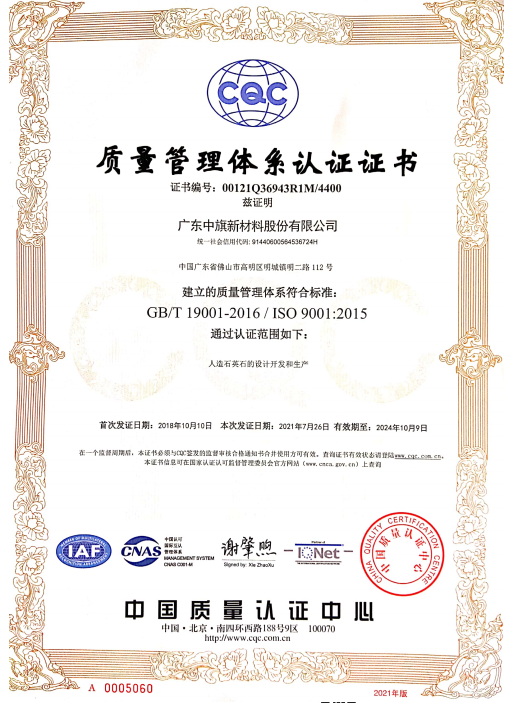 证明琅帝石英石产品的生产是符合国际质量管理体系的认证的。