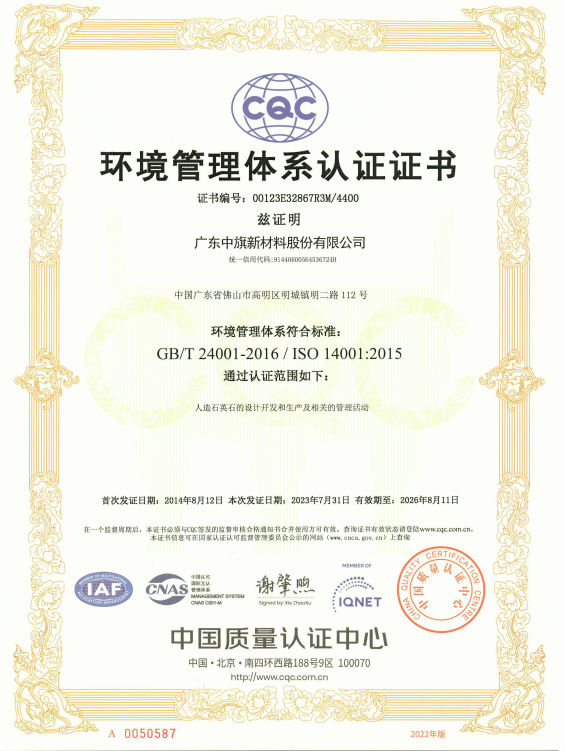 证明琅帝石英石产品的生产是符合国际环境管理体系的认证的。