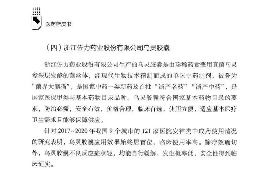 浙江佐力药业股份有限公司生产的乌灵胶囊是由珍稀药食兼用真菌乌灵参深层发酵的菌丝体,经现代生物技术精制而成的单味中药制剂,被誉为 “菌界大熊猫”,是国家中药一类新药及首批“浙产名药”“浙产中药”,是国家医保甲类与基本药物目录品种。乌灵胶囊符合国家基本药物目录的要求,防治必需,安全有效,价格合理,临床首选,使用方便,适应基本医疗卫生需求且能够保障供应。