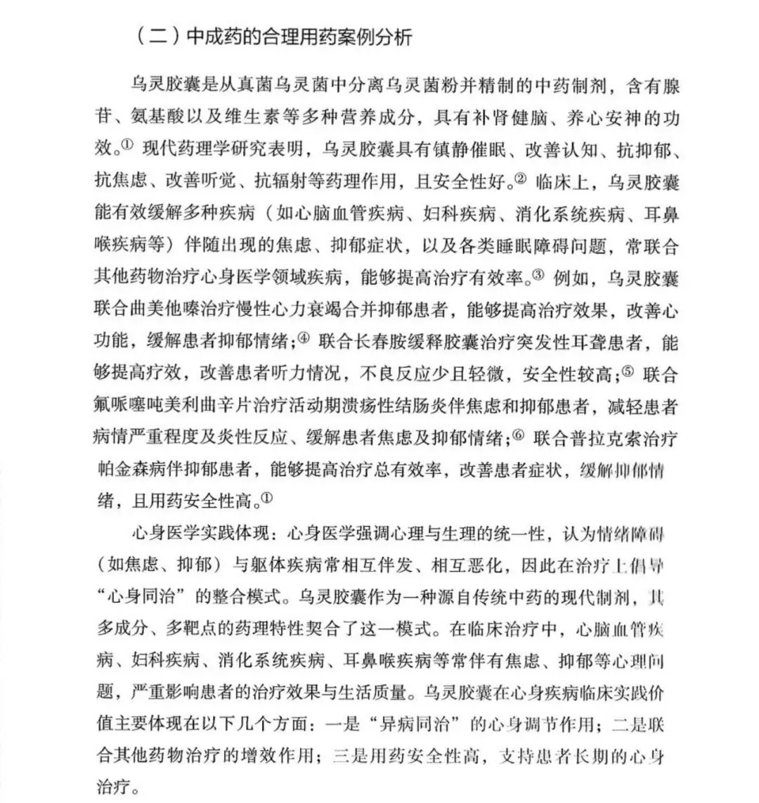 《心身医学领域合理用药研究报告》显示,心身医学实践体现:心身医学强调心理与生理的统一性,认为情绪障碍 (如焦虑、抑郁)与躯体疾病常相互伴发、相互恶化,因此在治疗上倡导 “心身同治”的整合模式。乌灵胶囊作为一种源自传统中药的现代制剂,其多成分、多靶点的药理特性契合了这一模式。在临床治疗中,心脑血管疾病、妇科疾病、消化系统疾病、耳鼻喉疾病等常伴有焦虑、抑郁等心理问题,严重影响患者的治疗效果与生活质量。乌灵胶囊在心身疾病临床实践价值主要体现在以下几个方面:一是“异病同治”的心身调节作用;二是联合其他药物治疗的增效作用;三是用药安全性高,支持患者长期的心身治疗。