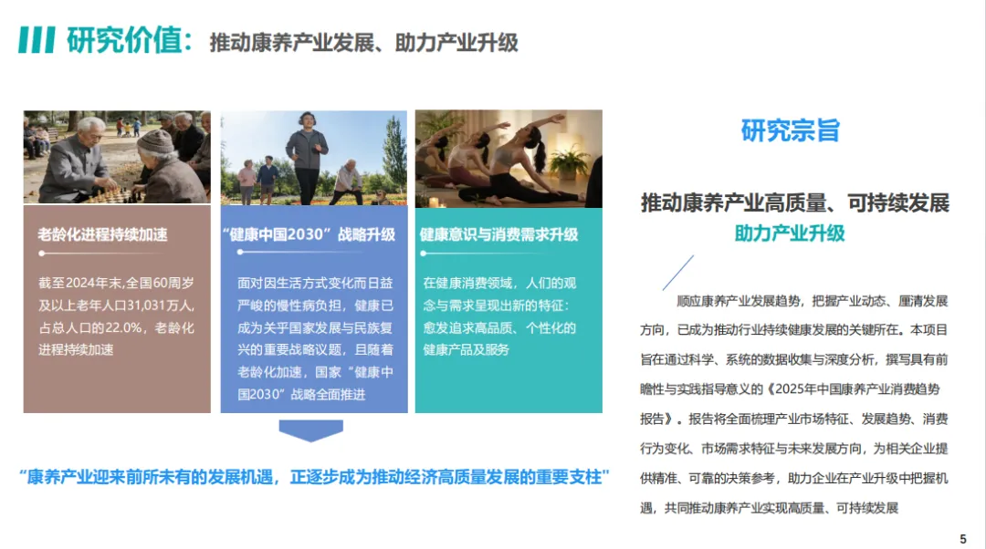 《2025 年中国康养产业趋势报告》由人民政协报文化传媒有限责任公司委托北京百慧信息咨询有限公司编制,基于全国 31 个省级行政区域 2535 份消费者问卷、行业数据及专家访谈,系统梳理了产业发展现状、用户特征与未来趋势,为行业发展提供了全面参考。
