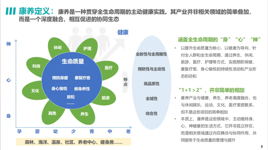 2025 年产业呈现五大核心特点:顶层设计落地,《医养结合示范项目工作方案(2025 年版)》推动行业进入标准化阶段;智慧康养加速落地,AI 大模型、智能机器人等技术广泛应用;标准体系逐步完善,养老服务、康养旅居等领域规范相继出台;产业融合深化,“康养 + 文旅”“康养 + 保险” 等模式快速发展;产教融合提速,多地成立康养产业学院构建人才体系。政策层面,国家与地方形成协同布局,涵盖战略引领、消费促进、养老服务等多维度,为产业发展提供坚实保障。