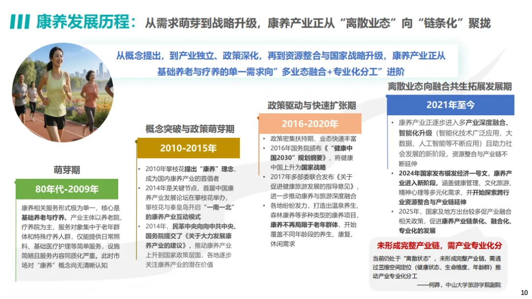 康养产业是以提升生命质量为核心,贯穿全生命周期的主动健康实践,融合健康、养老、医疗、文旅等多领域,呈现全龄性、预防性、综合性等特征,在个人健康提升、社会老龄化应对、经济结构优化等方面具有重要价值。历经萌芽期、概念突破期、政策驱动期后,当前产业正从离散业态向融合共生阶段演进,2025 年市场规模已达 9.8 万亿元,预计 2030 年将增至 14.6 万亿元。