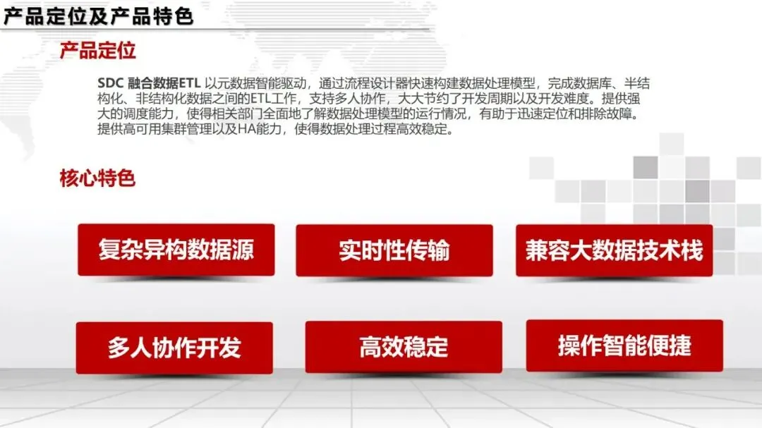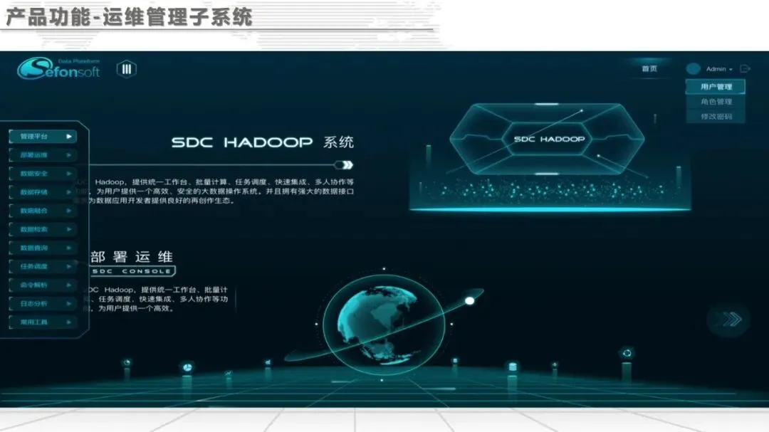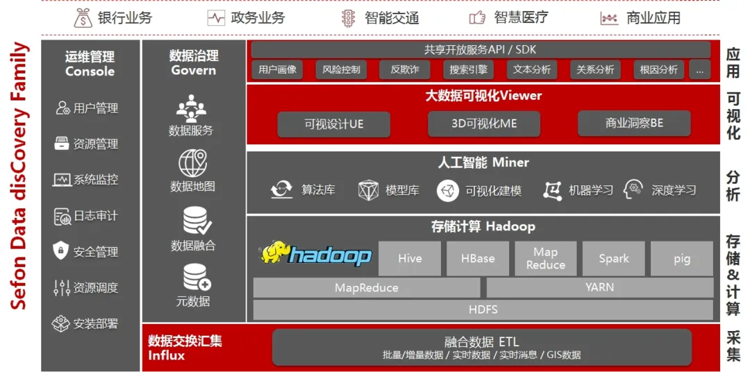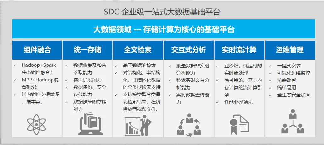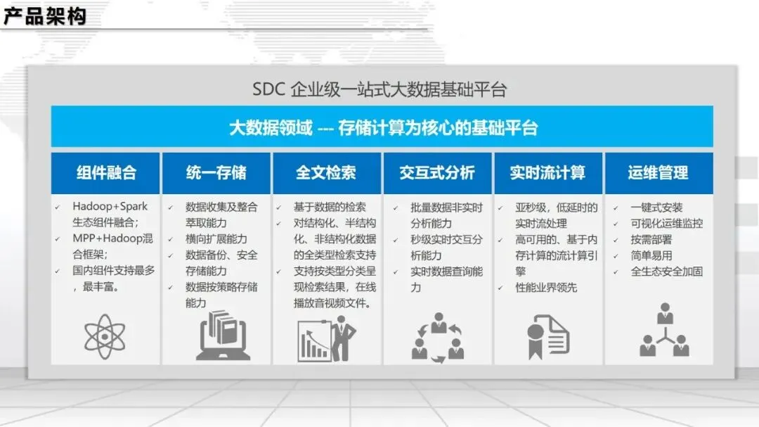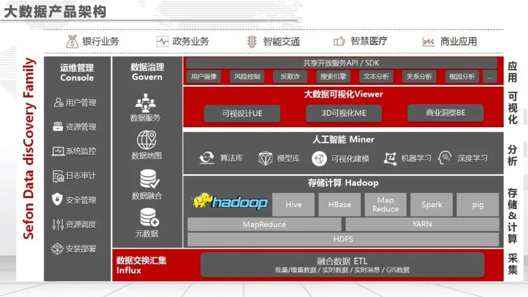 其核心产品包括数据收集、数据存储与计算、数据管理、人工智能挖掘和可视化等五个部分。SDC ETL数据采集平台能够同时支持多种数据源的访问,实现了数据的实时和批量处理,采用多人协同工作的方式,大大减少了系统的开发时间;Hadoop存储计算平台集成了多个生态组件,实现了海量存储和亚秒级的实时分析,对30T海量数据的查询速度达到了1.1秒/T,在中国信息产业部的测试中,Hadoop的性能处于业内领先水平。元数据驱动的数据治理平台实现了标准管理,质量控制,资产映射等多种功能,目前已经应用于40多个政府和政法领域的项目。集成超过140个算法的人工智能平台,支持GPU和分布式计算,大大降低了机器学习的使用门槛。三个可视化平台UE、ME和BE,可以满足大屏幕显示、多维交互和业务报表等多种场景的需求,用户可以轻松地进行拖拽操作,而不需要任何专业的技术知识。