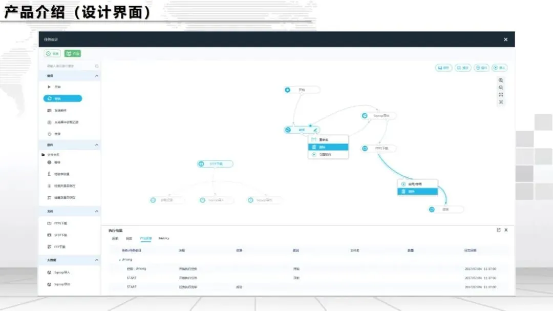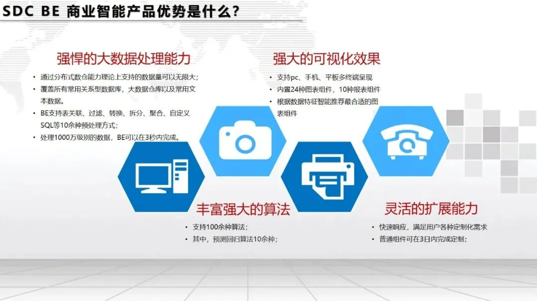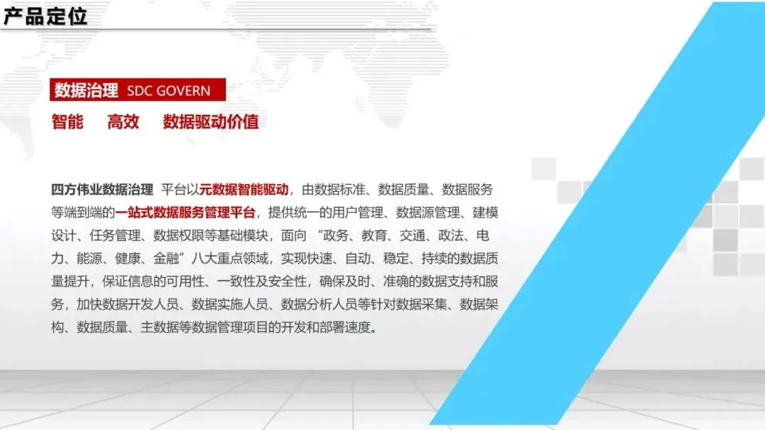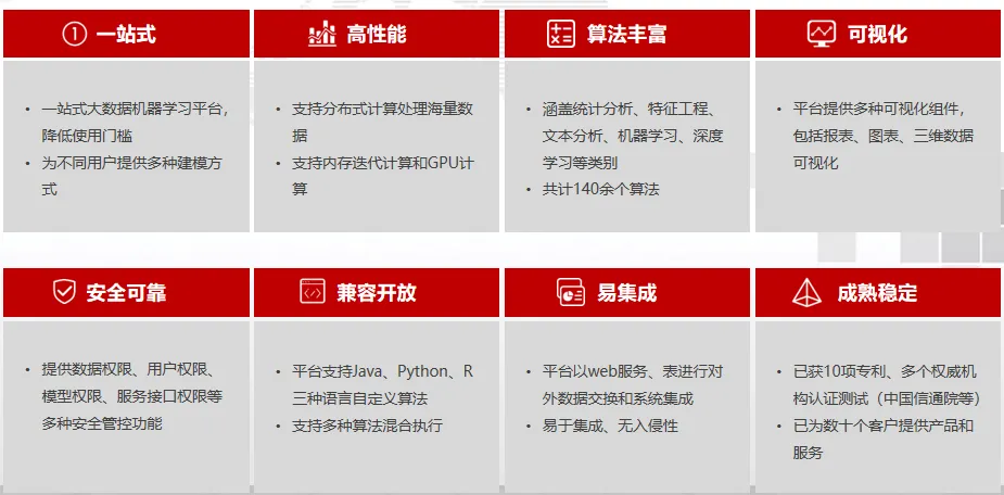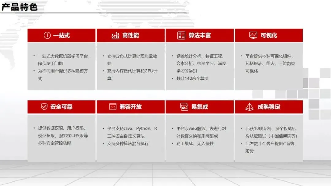 其核心产品包括数据收集、数据存储与计算、数据管理、人工智能挖掘和可视化等五个部分。SDC ETL数据采集平台能够同时支持多种数据源的访问,实现了数据的实时和批量处理,采用多人协同工作的方式,大大减少了系统的开发时间;Hadoop存储计算平台集成了多个生态组件,实现了海量存储和亚秒级的实时分析,对30T海量数据的查询速度达到了1.1秒/T,在中国信息产业部的测试中,Hadoop的性能处于业内领先水平。元数据驱动的数据治理平台实现了标准管理,质量控制,资产映射等多种功能,目前已经应用于40多个政府和政法领域的项目。集成超过140个算法的人工智能平台,支持GPU和分布式计算,大大降低了机器学习的使用门槛。三个可视化平台UE、ME和BE,可以满足大屏幕显示、多维交互和业务报表等多种场景的需求,用户可以轻松地进行拖拽操作,而不需要任何专业的技术知识。