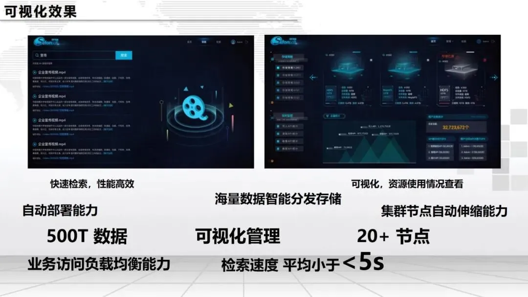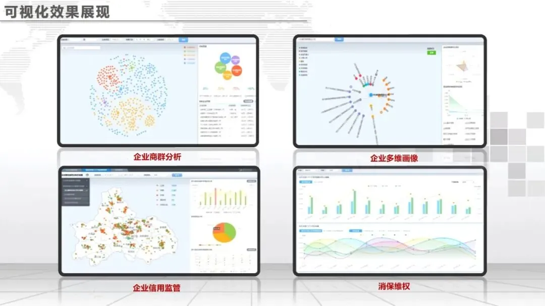 典型应用成果:全国版权云工程实现了500 T海量数据的智能分类和存储,平均检索时间不到5秒钟;全国版权云工程实现了500 T海量数据的智能分类和存储;工商部门建立企业多维脸谱-信用评级系统,支持精准监管和服务;法院场景实现了案件整体特征识别和法官效能分析,促进了审判的公平性;智能城市运行管理中心将经济数据、交通数据和安全数据集成在一起,对城市的运行状况进行实时监测,并提供决策支持。