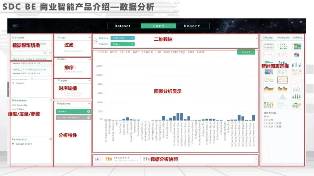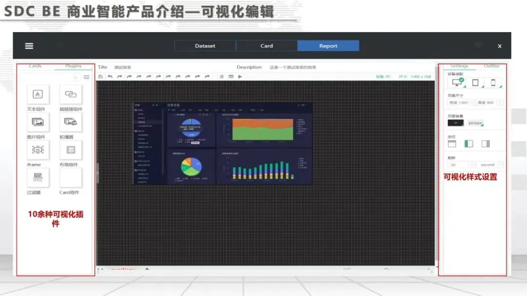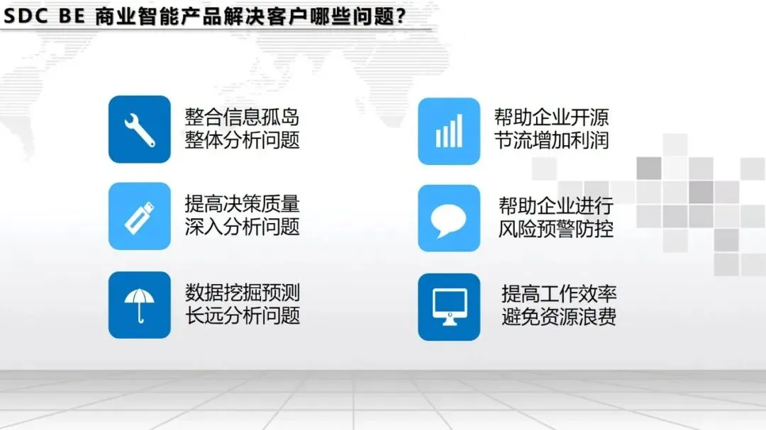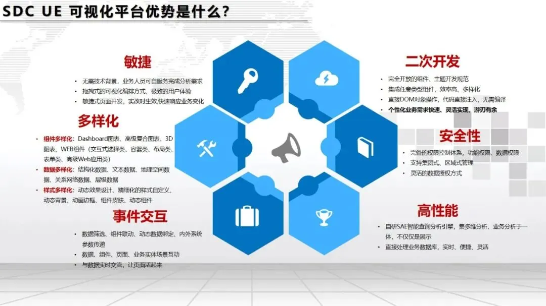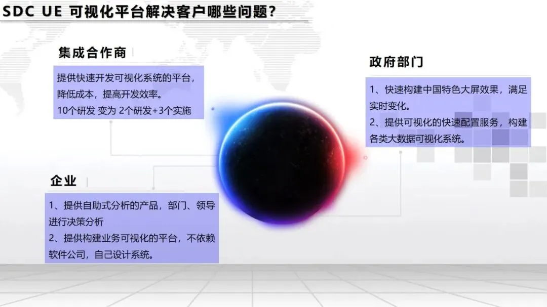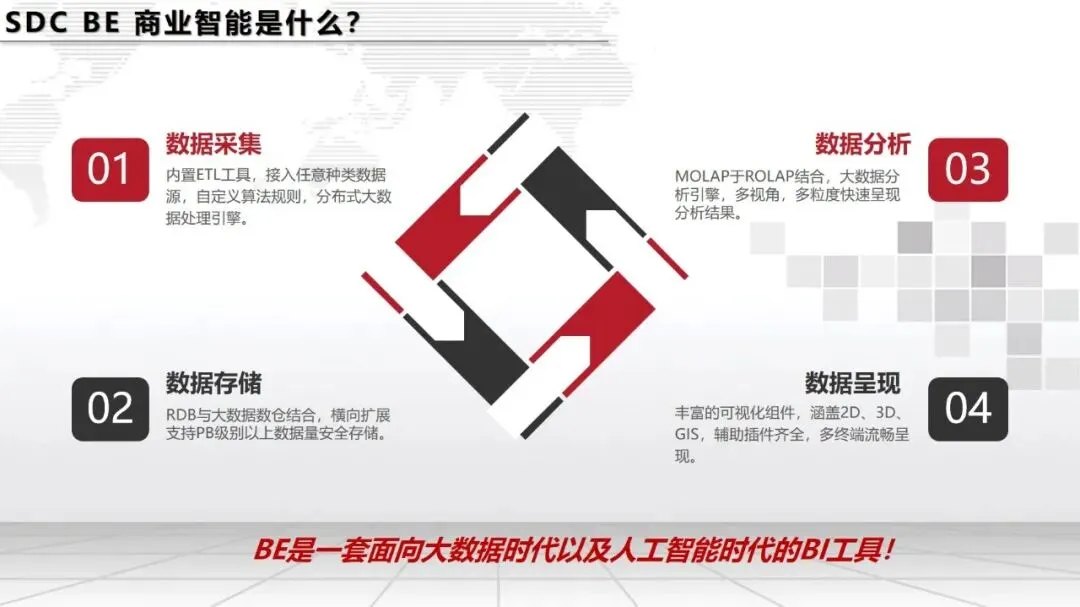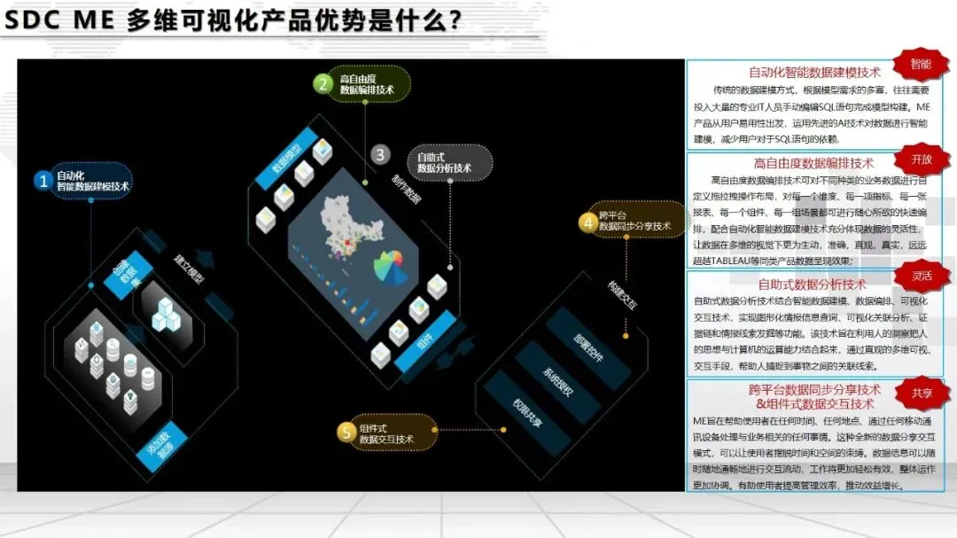 大数据可视化平台方案围绕 SDC产品,构建“数据采集、数据存储、数据计算、数据分析、数据可视化”的一体化服务体系,满足政府、金融、能源和交通等多个行业的实际需要,在技术实现和业务应用方面都达到了较高的水平。