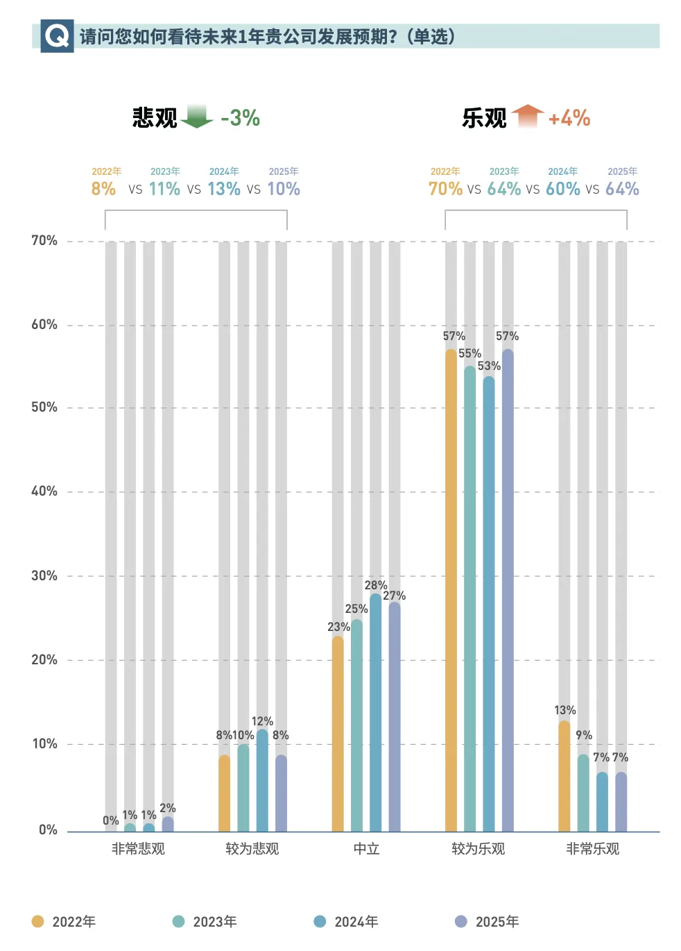 调研显示,营销决策者对宏观经济的信心已“触底企稳”,乐观预期从2024年的22%回升至28%。更有趣的是市场呈现出“宏观悲观,微观乐观”的分裂态势,尽管32%的受访者对宏观环境持谨慎态度,但高达64%的决策者对自身企业未来1年的发展充满信心 。