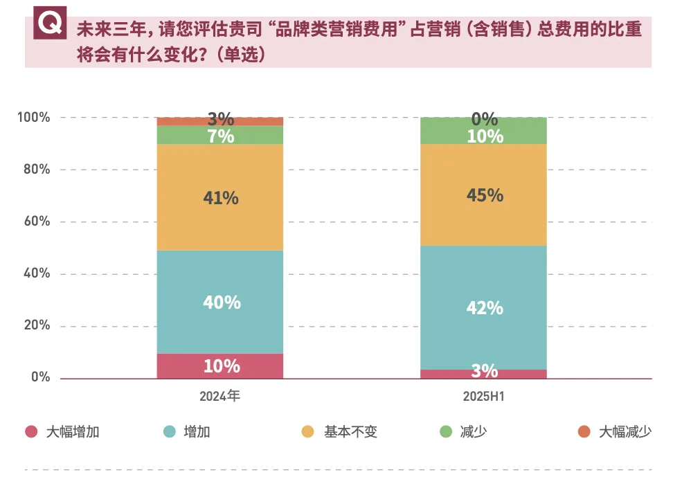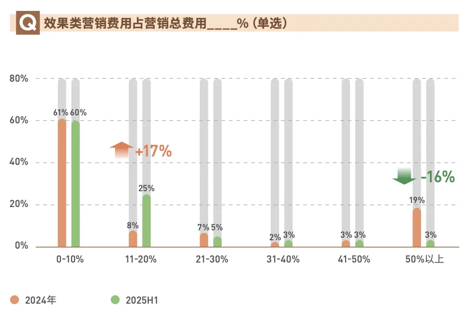 在营收承压的背景下,营销预算正经历深刻的结构性变革。报告显示,2025 上半年营销总费用占营收比重保持稳定,但投入方向发生显著调整,CMO 们在维持品牌类营销费用稳定的同时,降低了效果类营销费用占比。