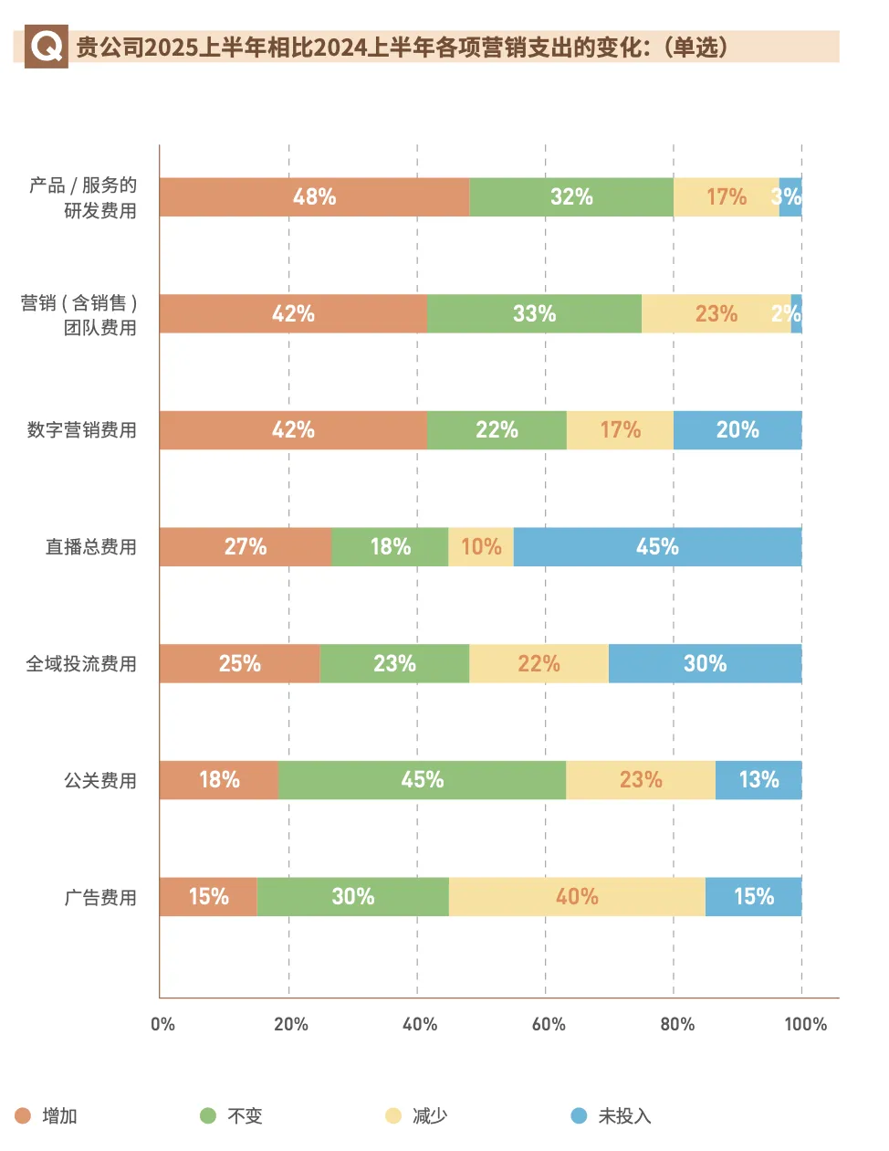 数据显示48% 的企业增加了产品 / 服务研发费用,42% 的企业提升了营销团队投入,42% 的企业加大了数字营销支出,而 45% 的企业减少了直播费用,30% 的企业缩减了全域投流预算。这一加一减标志着CMO们正在将预算从"直播费用"" 全域投流 "等" 租用流量 "的短期费用,转化为“产品、人才、数据”的长期企业资产。