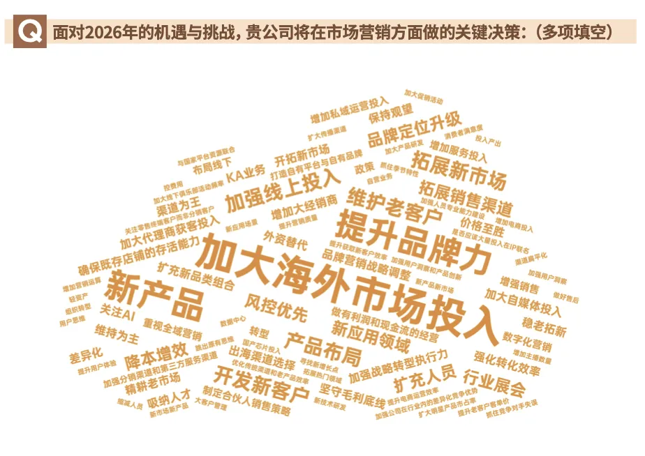 面向 2026 年,45% 的企业计划增加营销投入,海外市场、品牌建设和新产品投入成为三大核心发力方向,以寻求更具正向性和持续性的增长动力。