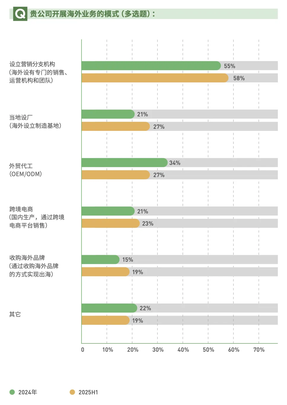 出海模式正从简单出口转向深度本地化,58% 的企业已设立海外分支机构,27% 实现海外设厂,自建渠道占比从 26% 激增至 50%。