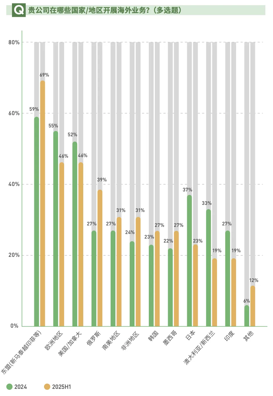 东盟、欧洲、北美是主要目标市场,其中东盟市场渗透率达 69.2%,成为中国企业出海的首选。相比欧洲、北美等区域,2025中国企业对新兴市场布局较发达市场布局全面提升 。