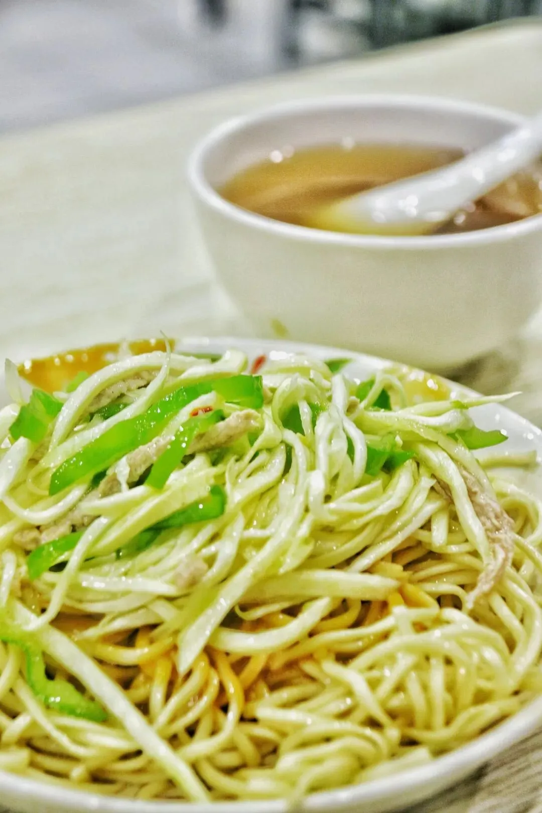 他家浇头绝对是一大亮点,茭白丝白嫩鲜甜,肉丝也很新鲜但量少,面条是偏硬类型,桌上有醋可以根据自己口味添加哦。