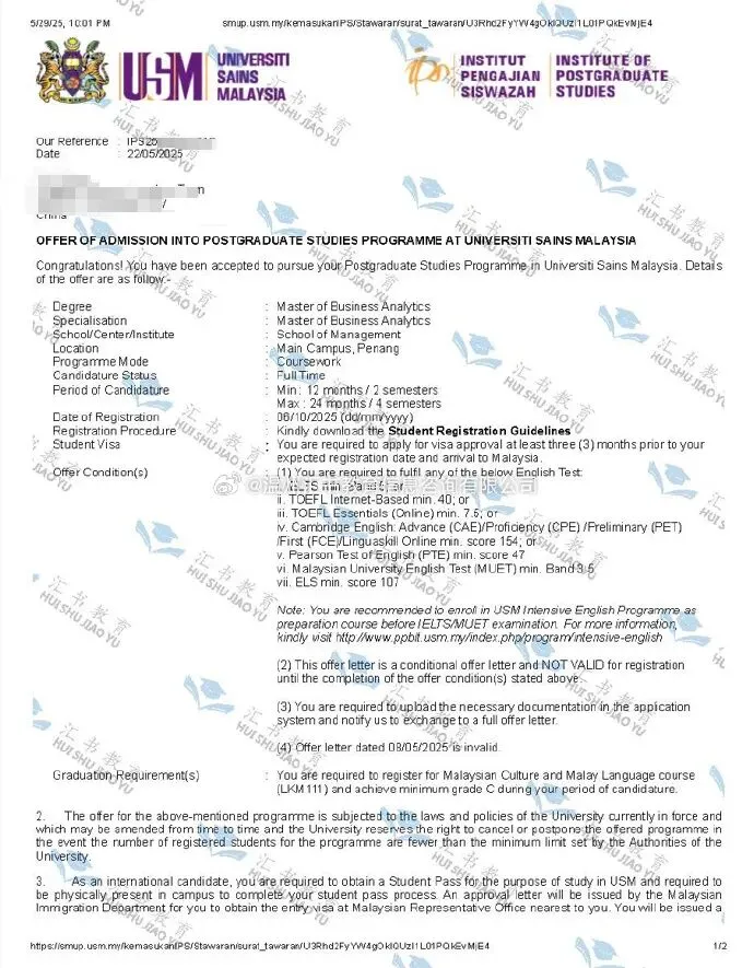 chen同学 获得马来西亚理科大学商业数据分析硕士录取通知书 !