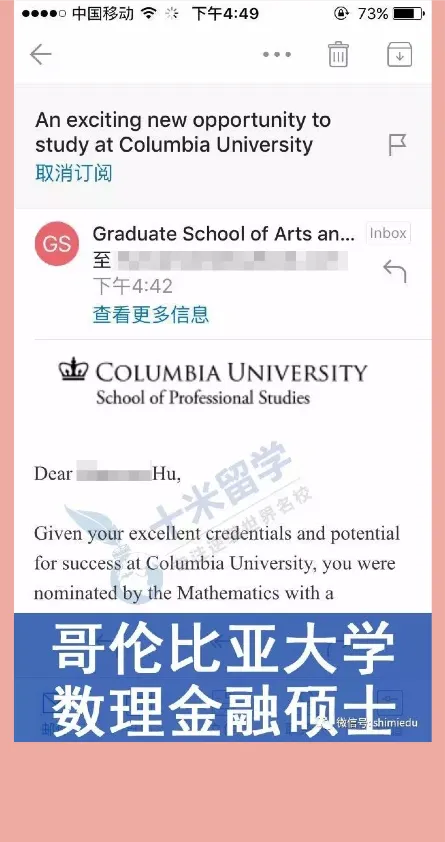 网申提交以后,也许是因为背景和文书的优秀,胡同学很快便陆续收到了学校的面试通 知。而此前从未接触过留学,胡同学对此便是一窍不通,怎么办?不用担心,有十米!在收到面试通知信的时候,申请老师在第一时间便给胡同学发去了面经,并通过沟通交流预约了 面试对练的时间,模拟面试,这让胡同学更加有自信突破重重阻碍,顺利获得名校录取。当然,这也是必须的,在意料之中,胡同学很快便获得了名校的offer,一个接一个,其中还包 括了美国排名第4的哥伦比亚大学,简直重磅了有木有?有木有?有木有?有!