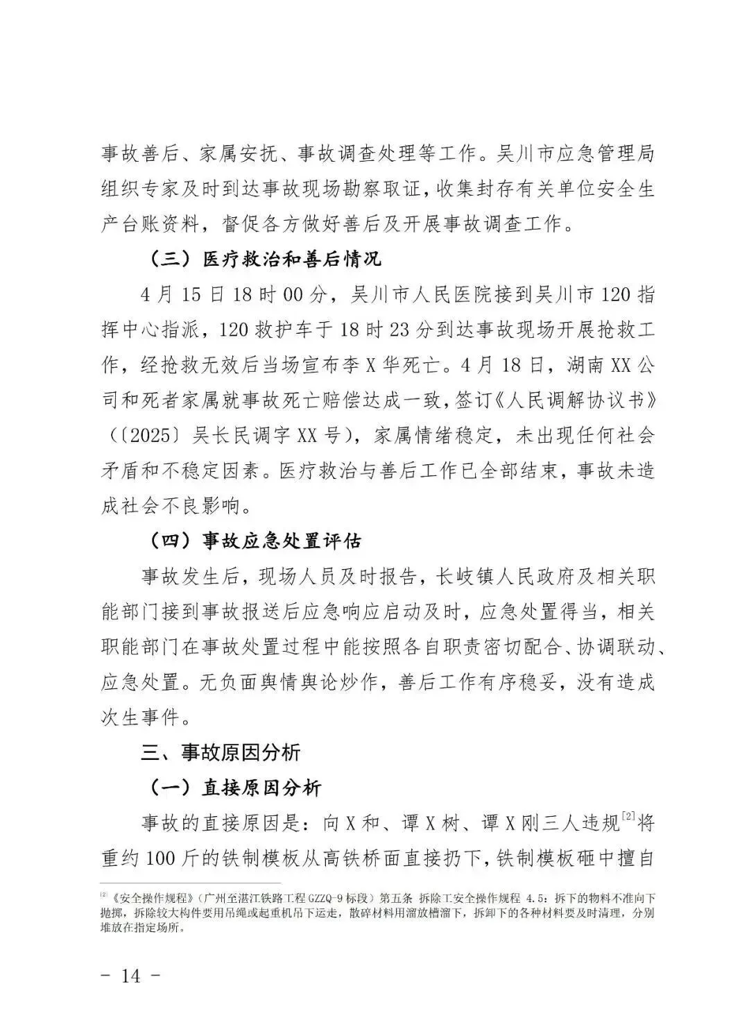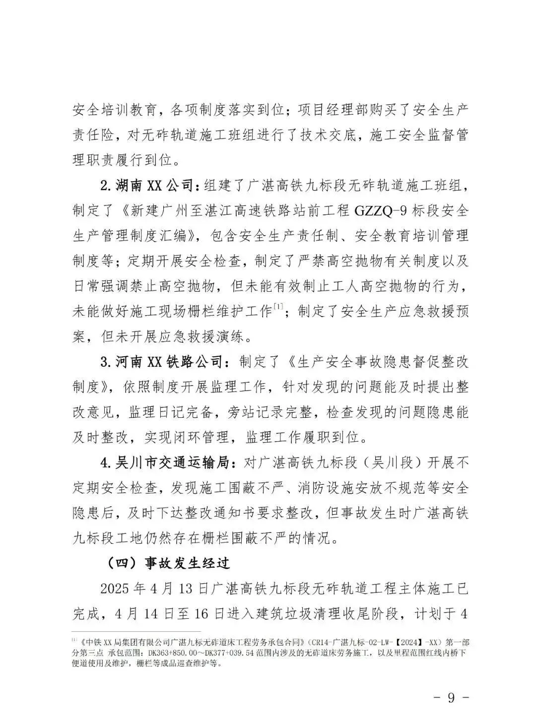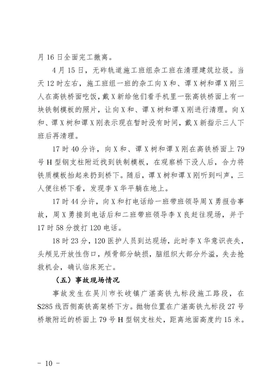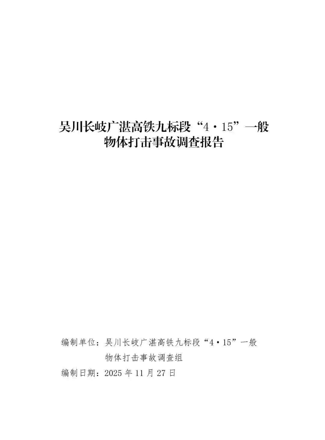 经调查认定,吴川长岐广湛高铁九标段“4·15”一般物体打击事故是一起因安全教育培训和安全监管不到位,从业人员违规进行高空抛物造成的一般生产安全责任事故。