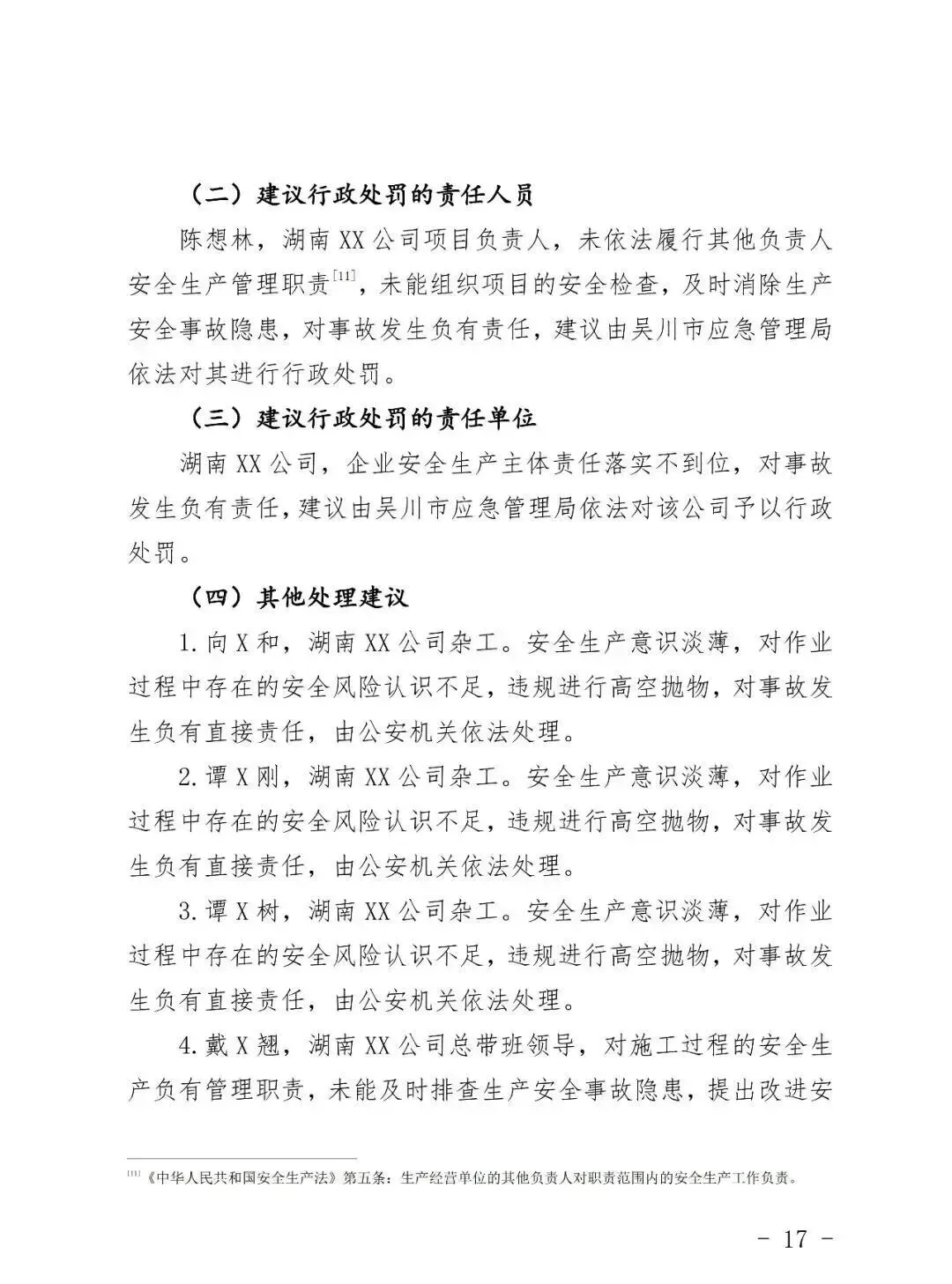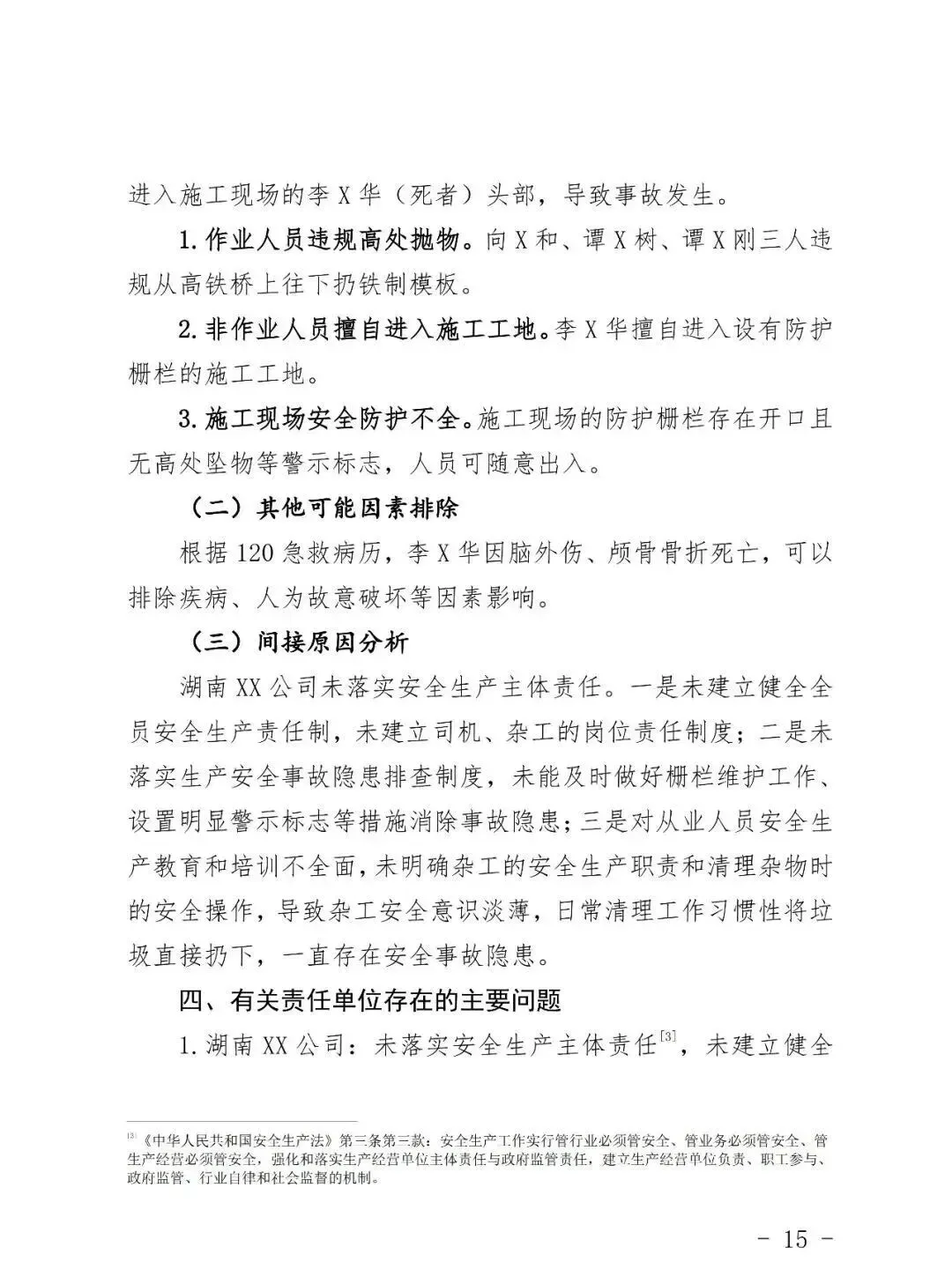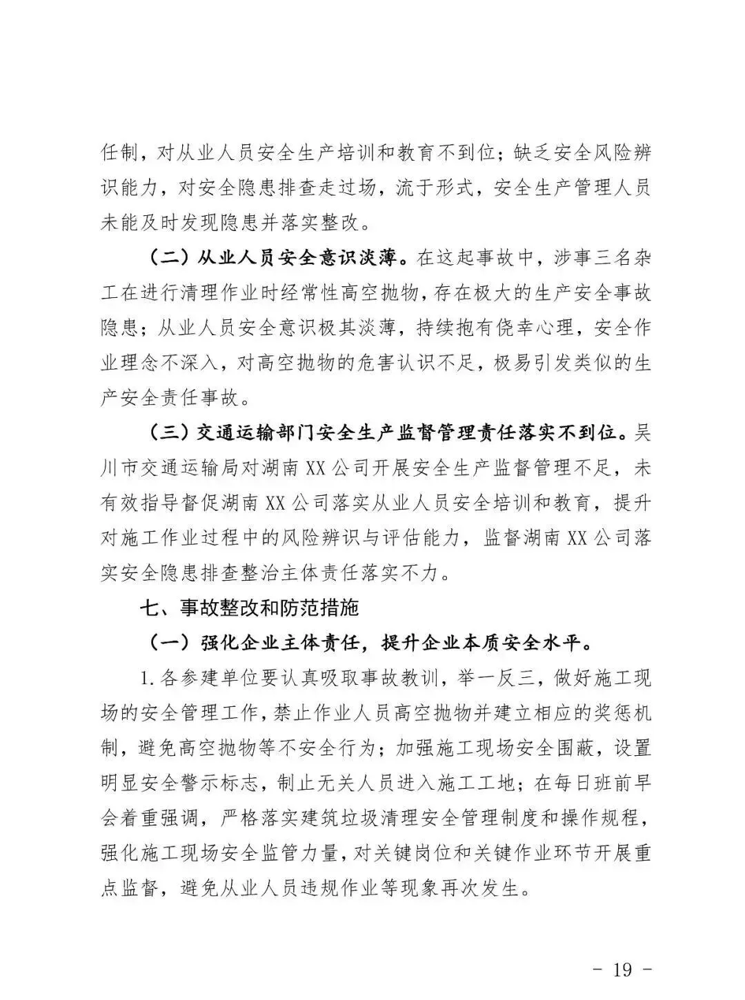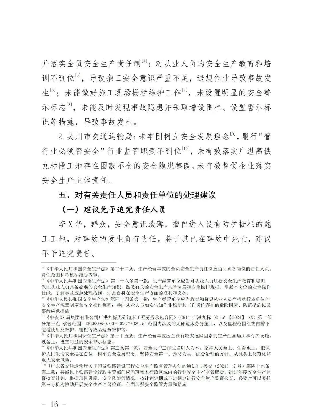 经调查认定,吴川长岐广湛高铁九标段“4·15”一般物体打击事故是一起因安全教育培训和安全监管不到位,从业人员违规进行高空抛物造成的一般生产安全责任事故。