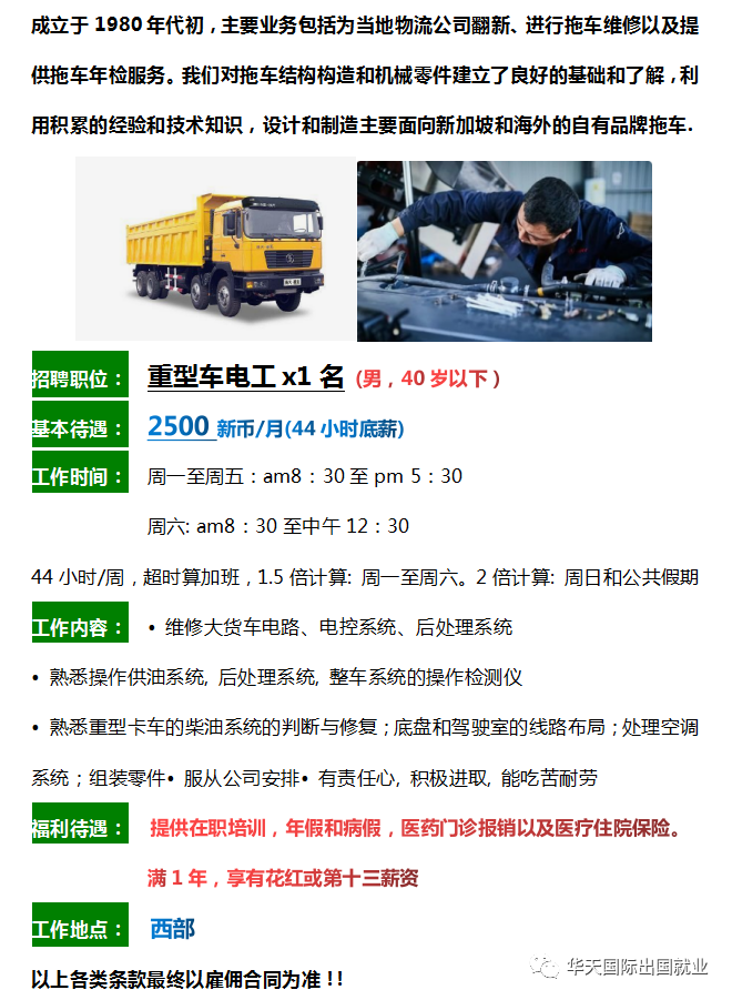 新加坡知名大车维修公司招聘 重型车维修电工 x1名,男生,40以下,相关相关经验丰富