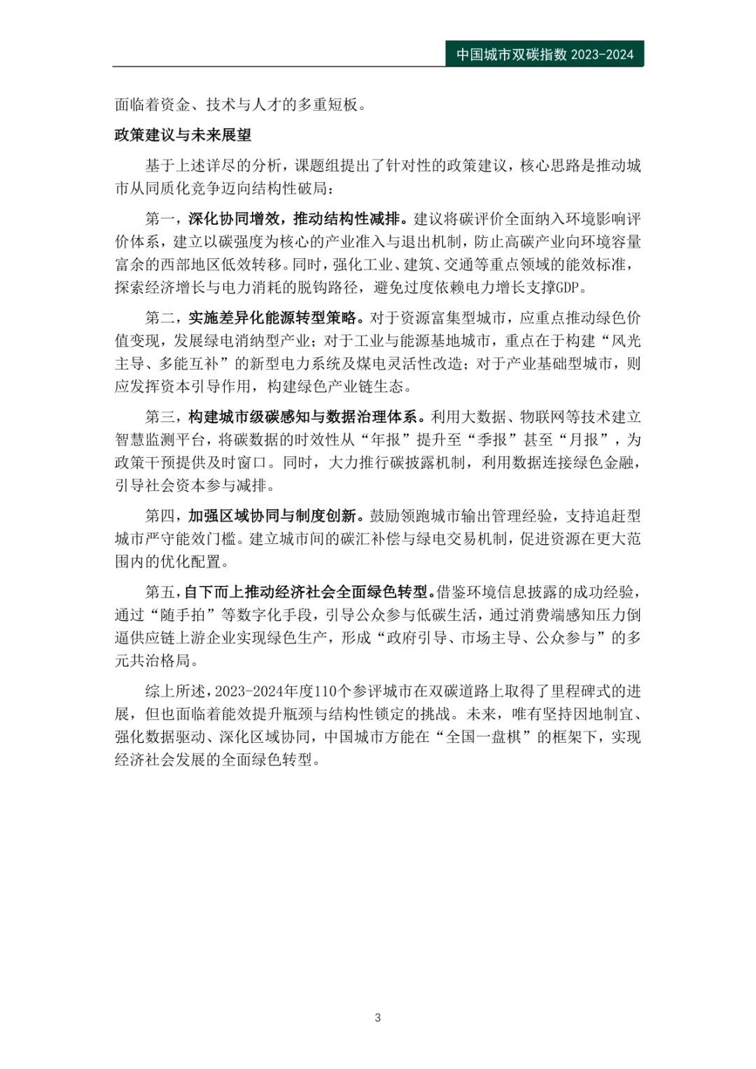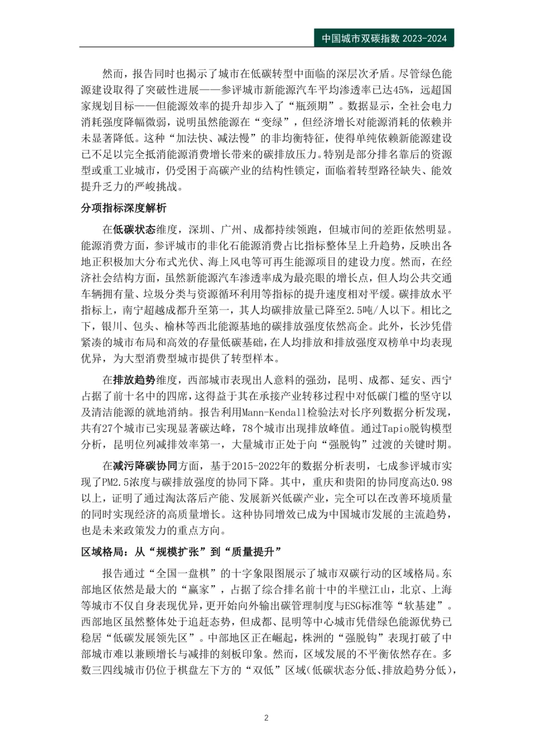 中国城市双碳转型已进入实质性落实阶段,110 个参评城市综合表现呈现差异化发展格局。北京蝉联双碳指数榜首,成都、上海、宁波、昆明等城市跻身前五,中部老工业基地株洲凭借产业转型首次进入前十,展现出 “因地制宜” 的转型成效。气候雄心分指数连续三年稳步上升,排放趋势分指数实现止跌回稳,低碳转型基础持续巩固。绿色能源领域实现生产与消费双端突破,参评城市新能源汽车平均渗透率达 45%,远超国家规划目标。非化石能源消费占比稳步提升,昆明、盐城等城市提前超额完成 2025 年目标。能效提升步入瓶颈期,全社会电力消耗强度降幅微弱,部分资源型城市受结构性锁定制约,转型路径仍待探索。减污降碳协同成为主流趋势,七成城市实现 PM2.5 浓度与碳排放强度同步下降。未来需深化结构性减排,实施差异化能源转型策略,构建城市级碳感知体系,加强区域协同与公众参与,推动城市从同质化竞争迈向高质量低碳发展。