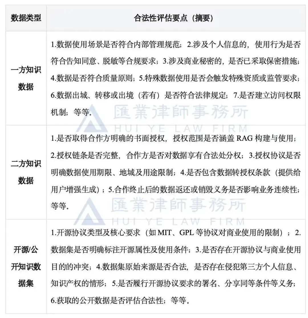 汇业黄春林律师团队建议,企业应当根据《网络数据安全管理条例》《生成式人工智能服务管理暂行办法》等规定,确保数据来源合法性,依法履行相应的合规义务,具体的审查评估要点包括但不限于: