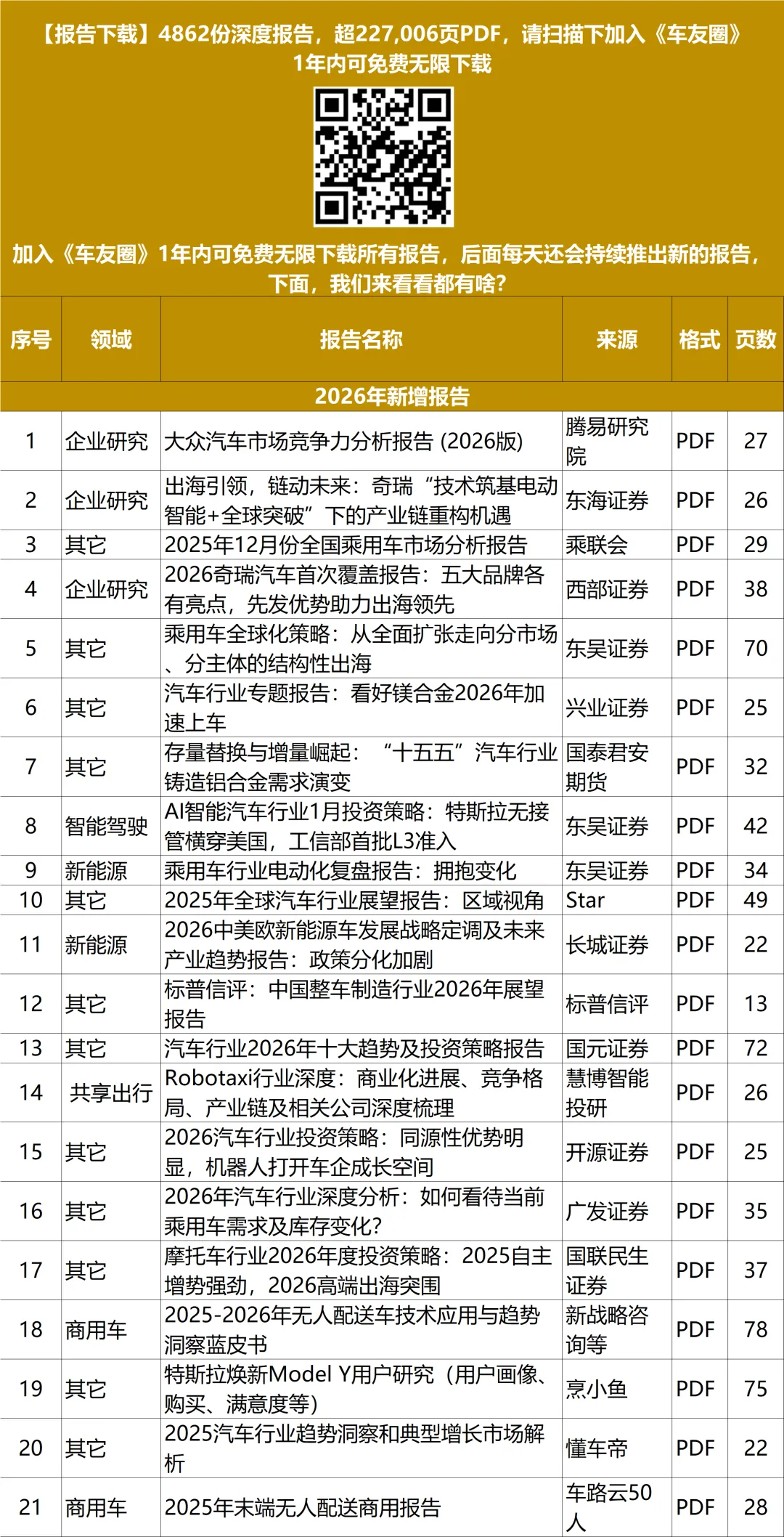 PS:加入《车友圈》1年内可免费下载《车友圈》内所有的报告,包括:智能网联、新能源、共享出行及传统汽车行业报告等,目前每天仍会新增至少1篇行业报告,欢迎加入。