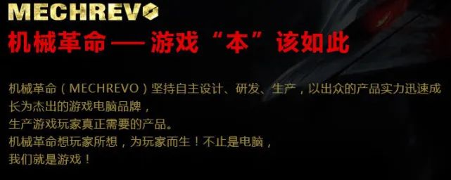 MECHREVO(机械革命),是2014年诞生的全新的游戏电脑品牌。是面向电脑游戏玩家推出的游戏电脑品牌。是要拉近游戏电脑产品和真正的玩家之间的距离,生产游戏玩家们真正需要的游戏电脑产品。其超越的性能带给游戏玩家强悍的冲击。面对游戏发烧友同样不惧挑战,可以应对现下流行各类大型游戏。能与游戏玩家合二为一,并肩作战。作为游戏电脑品牌,品质完全达标,契合游戏玩家的所有需要,其搭载的硬件也能带给游戏玩家不一样的体验。