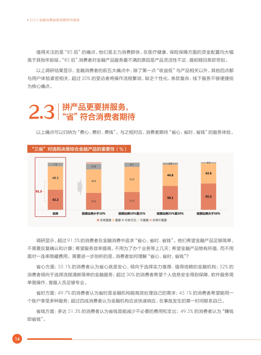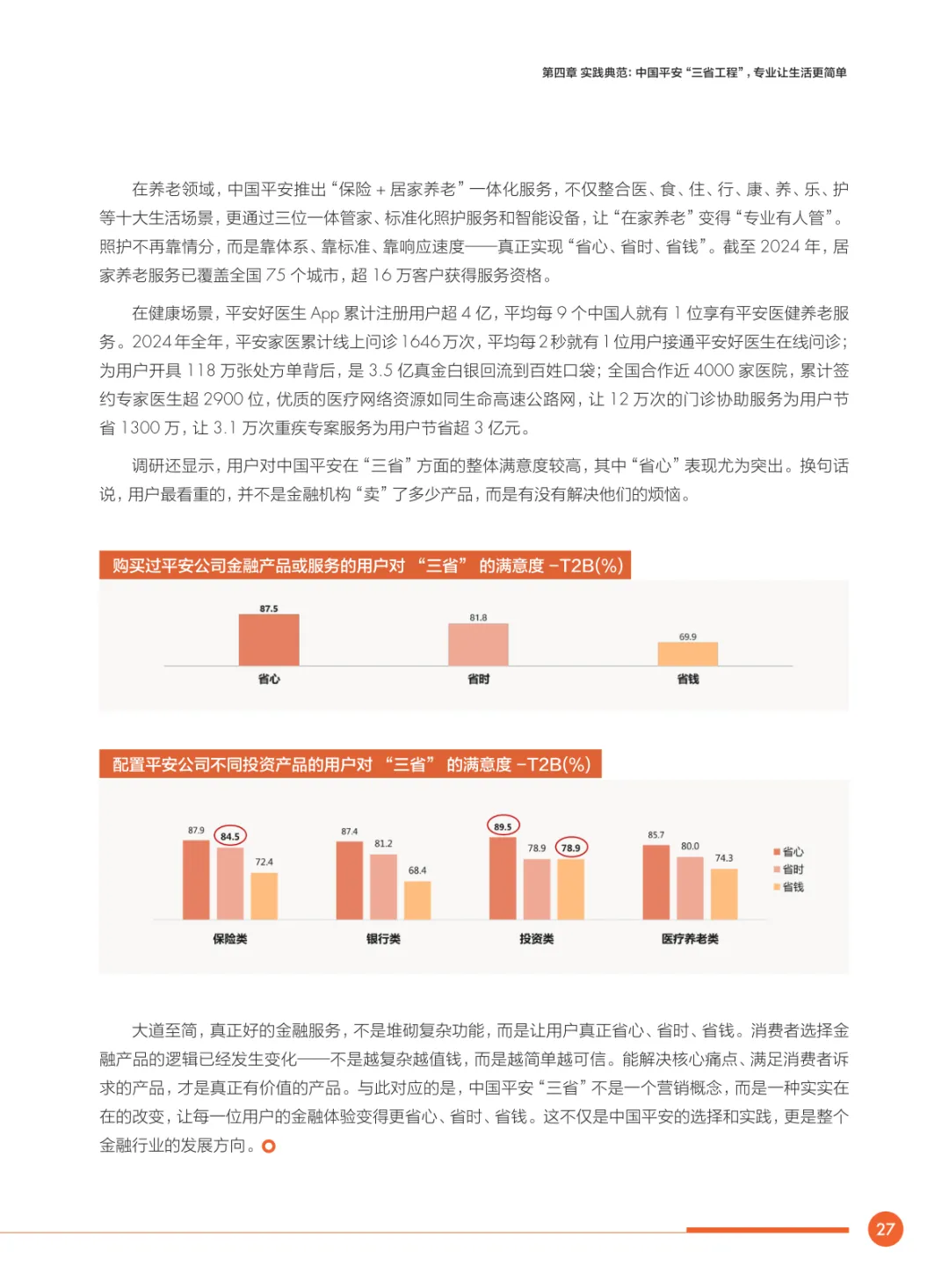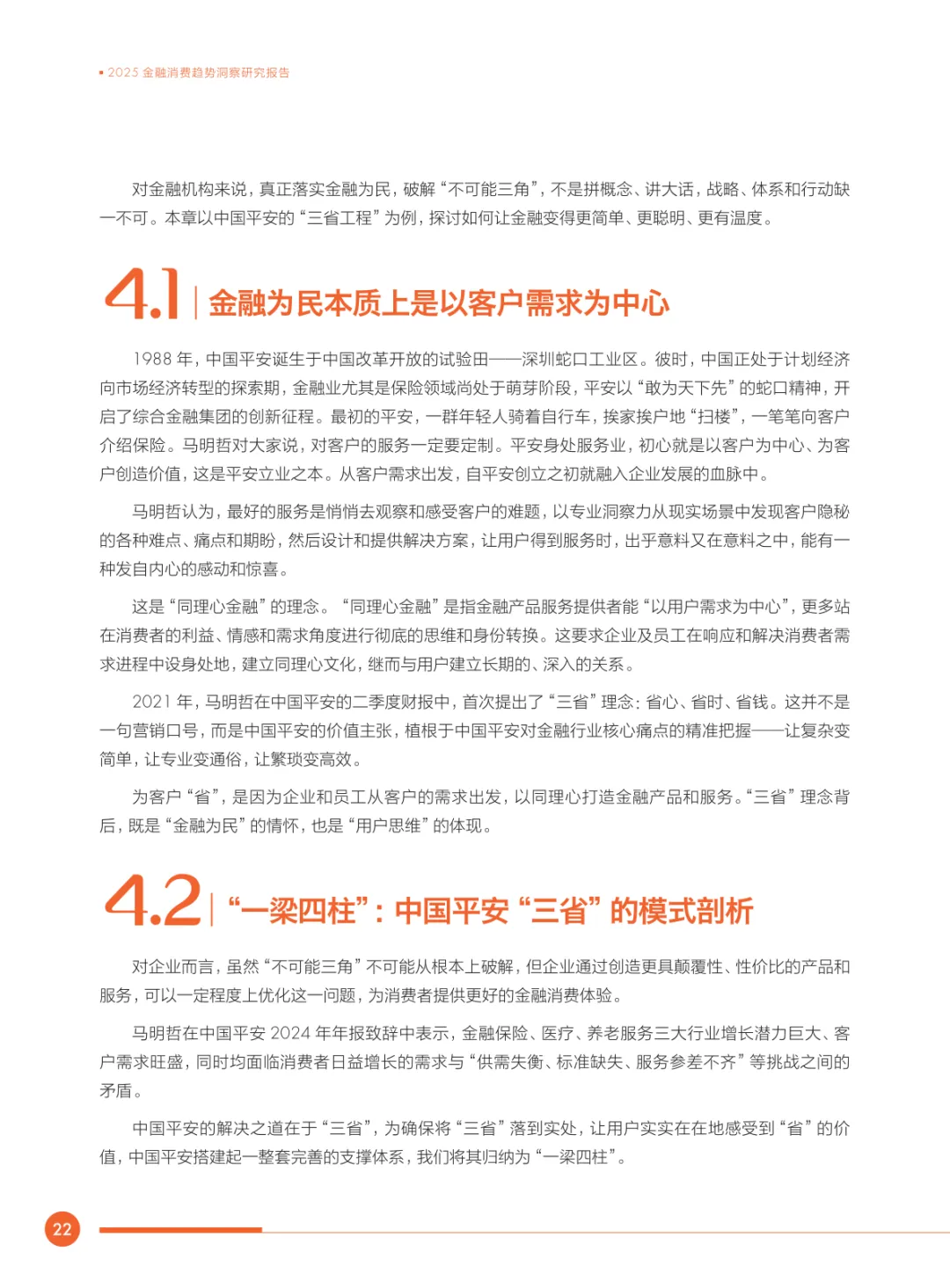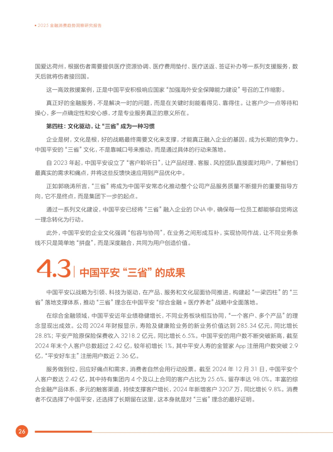 导读:2025 年金融消费呈现显著转型,“及时行乐” 需求让位于 “保障未来”,医疗健康、保险保障及养老规划成为核心诉求。95 后对养老规划的重视超消费娱乐,各年龄段均倾向稳健资产配置,保险类产品持有占比居首。用户痛点集中于产品收益不及预期、条款复杂、操作繁琐,超九成消费者期待 “省心、省时、省钱” 的金融服务。金融行业面临 “收益、风险、流动性” 的不可能三角困境,医疗养老领域存在产品供给缺口。中国平安以 “综合金融 + 医疗养老” 战略为核心,通过科技赋能、产品创新、专业服务与文化驱动构建 “一梁四柱” 体系,落地 “三省工程”。其实践证明,金融机构需以客户需求为中心,通过简化流程、提升透明度、精准匹配需求,破解行业痛点,践行 “金融为民” 理念。