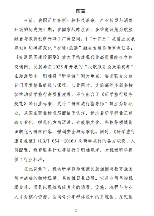 当前,我国正处在新一轮科技革命、产业转型与消费升级的历史交汇期。在国家战略层面,多维度政策为航旅融合与教育创新开辟了广阔空间。《“十四五”旅游业发展规划》明确将深化“交通+旅游”融合发展作为重点任务;《交通强国建设纲要》致力于构建现代化高质量综合立体交通网;民航局在2025年开展的“民航服务提振消费年”主题活动中,明确将“研学游”列为重点,要求联合文旅部门开发精品航线与课程。与此同时,文旅部等多部委持续推动研学旅行高质量发展,标志着研学行业正朝着专业化、规范化方向迈进。