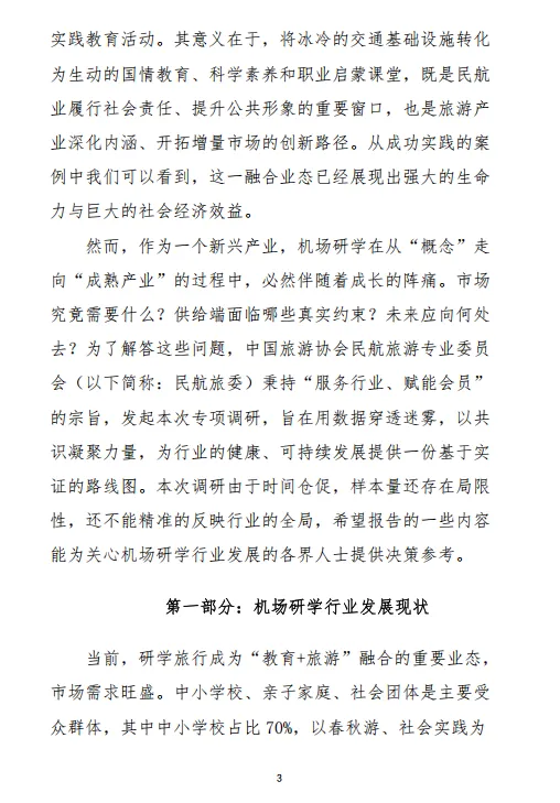 中国旅游协会民航旅游专业委员会(以下简称:民航旅委)秉持“服务行业、赋能会员”的宗旨,发起本次专项调研,旨在用数据穿透迷雾,以共识凝聚力量,为行业的健康、可持续发展提供一份基于实证的路线图。本次调研由于时间仓促,样本量还存在局限性,还不能精准的反映行业的全局,希望报告的一些内容能为关心机场研学行业发展的各界人士提供决策参考。