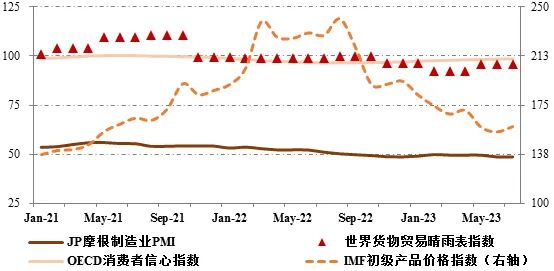 2023年上半年,全球经济在服务业稳定复苏、国际供应链恢复通畅以及通货膨胀水平逐步回落支撑下维持低速增长,但主要经济体央行持续加息对经济复苏的负面影响持续显现,消费端复苏依旧乏力,制造业及商品贸易景气低迷。全球制造业景气指数连续11个月处于收缩区间,7月J.P. Morgan制造业采购经理指数(PMI)为48.7,其中新出口订单指数仅为46.3,均降至今年以来新低;美国、德国、日本制造业PMI全部处于紧缩区间。经合组织(OECD)消费者信心指数回升至98.5,但仍连续第24个月低于荣枯线。世界贸易组织(WTO)5月发布的全球货物贸易晴雨表指数为95.6,低于100趋势水平。国际大宗商品价格持续回落,7月国际货币基金组织(IMF)初级产品价格指数为158.7,较上年同期大幅下降69.7个百分点。