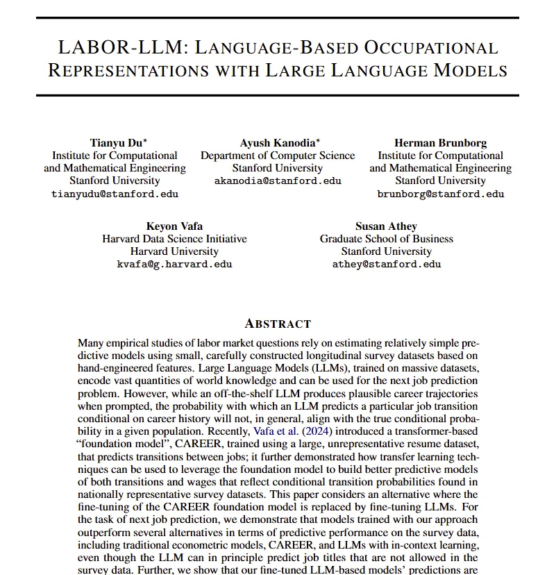 “LABOR-LLM: LANGUAGE-BASED OCCUPATIONAL REPRESENTATIONS WITH LARGE LANGUAGE MODELS” 聚焦于劳动经济学领域中职业轨迹预测的核心问题,提出了 LABOR-LLM 框架,旨在通过大型语言模型(LLMs)构建更具代表性的职业预测模型,突破传统方法在数据规模、模型灵活性与预测准确性上的局限。该论文由来自斯坦福大学、哈佛大学的 5 位研究者合作完成。