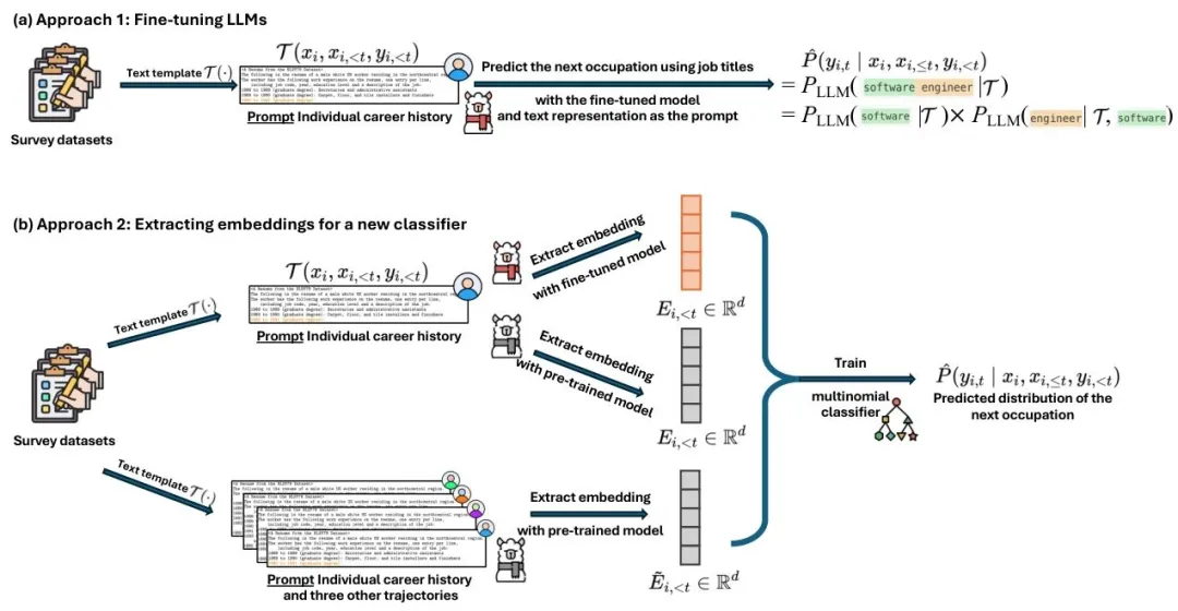 在方法设计上,论文提出两种基于 LLMs 的职业预测路径,并与传统计量模型、CAREER 模型及零样本 LLMs 进行对比。第一种路径是直接微调 LLMs:将个体职业历史与特征通过文本模板转换为自然语言(如 “1988-1989(本科学历):秘书与行政助理”),以因果语言建模(CLM)为目标,在调查数据集的训练集上微调 Llama-2 系列模型(7B、13B、70B 参数),让模型学习预测职业标题的 token 序列。第二种路径是基于 LLM 嵌入的分类器:先通过 LLM(零样本或微调后)提取职业历史文本的嵌入向量,再在嵌入向量上训练多分类逻辑回归模型,直接预测职业编码。此外,论文还探索了 “提示中加入职业列表”“上下文学习(在提示中加入 3 个完整职业轨迹示例)” 等优化策略,以提升零样本 LLMs 的表现。